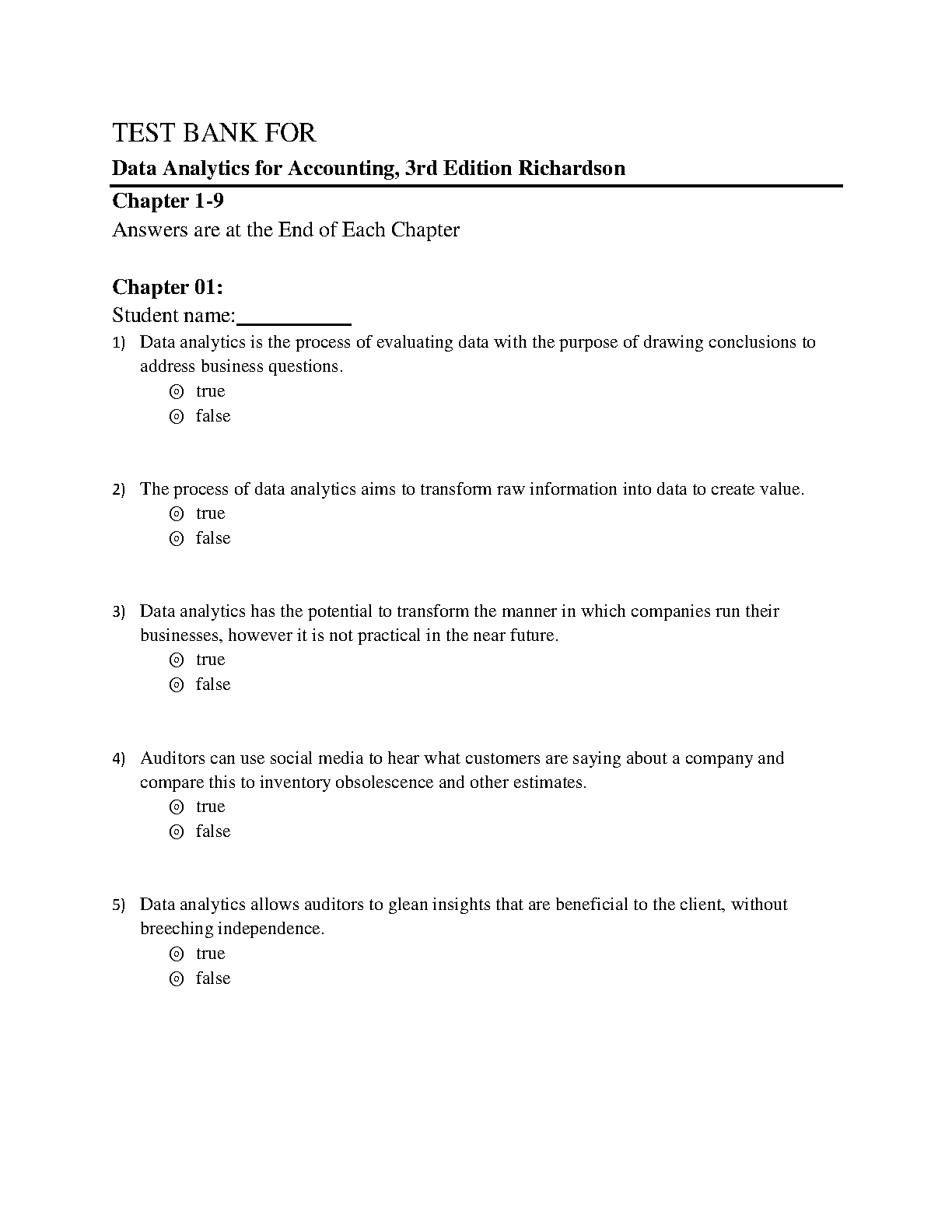 Unlock your full potential and master accounting principles with our official Test Bank for 'Data Analytics for Accounting, 3rd Edition.' This comprehensive resource, authored by Richardson, Teeter, and Terrell, covers all key topics from Chapters 1-9. It features a wide array of exam-style questions complete with answers for each chapter, designed to sharpen your understanding and critical thinking skills. This study guide is your ultimate tool for effective exam preparation, helping you to confidently tackle your assessments and excel in your accounting course.