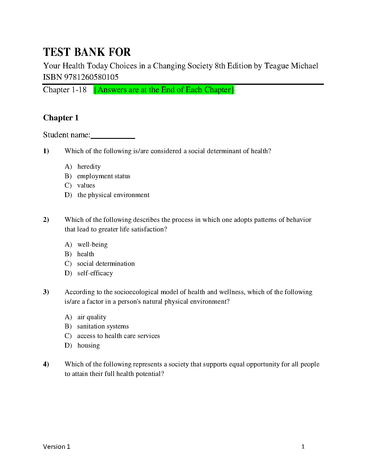 Test Bank for Your Health Today: Choices in a Changing Society, 8th Edition by Michael L. Teague, Sara L. C. Mackenzie, and David M. Rosenthal