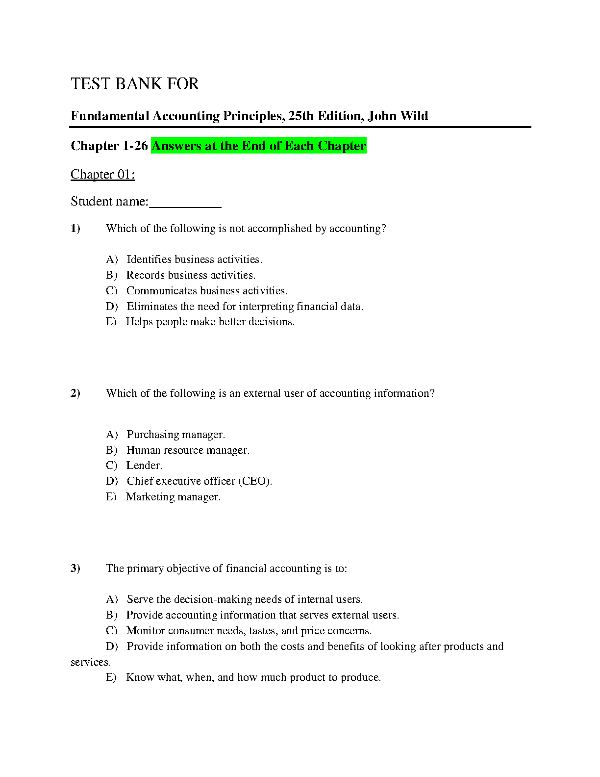 Test Bank for Fundamental Accounting Principles, 25th Edition by John J. Wild, Ken W. Shaw, and Barbara Chiappetta (Chapters 1-26 with Answers)