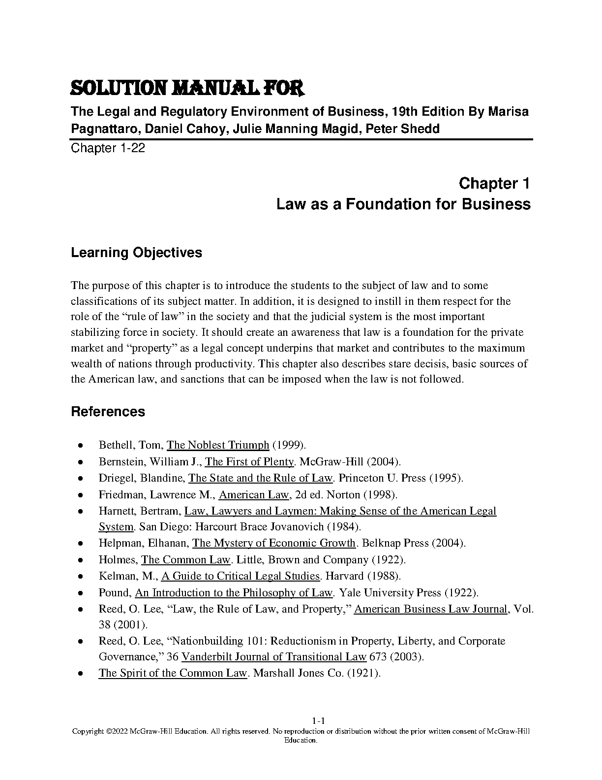 Solution Manual for The Legal and Regulatory Environment of Business, 19th Edition by Marisa Anne Pagnattaro, Daniel R. Cahoy, Julie A. Magid, Peter J. Shedd