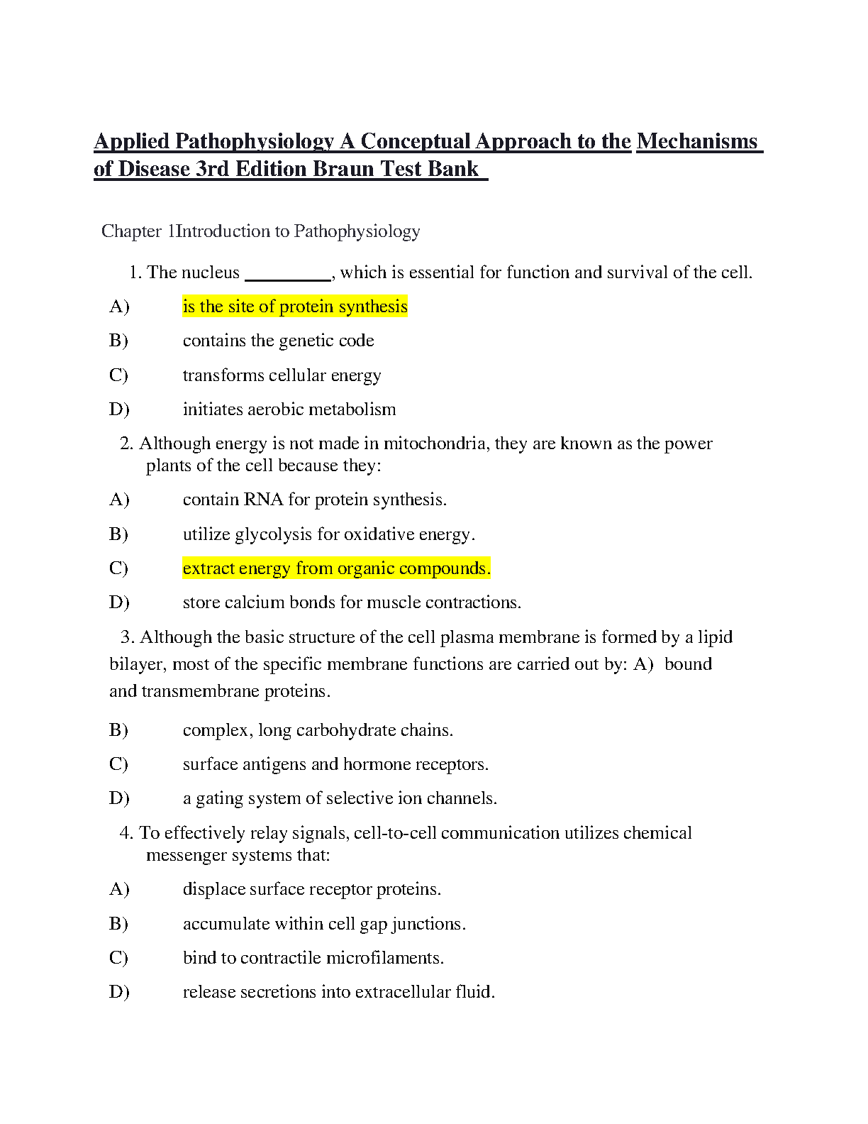 Test Bank for Applied Pathophysiology: A Conceptual Approach to the Mechanisms of Disease, 4th Edition by Carie A. Braun & Cindy M. Anderson