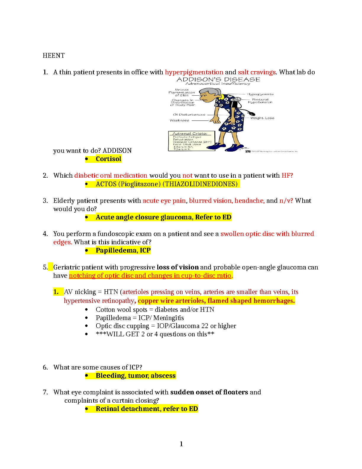 Unlock exam success with our latest 2025/2026 study guide, focusing on HEENT and related systemic conditions. This comprehensive exam elaboration provides verified questions and answers on critical topics you'll face on your boards. Dive deep into the diagnosis and management of Addison's disease, contraindications for diabetic medications in heart failure, and urgent eye emergencies like acute angle closure glaucoma and retinal detachment. Master the interpretation of fundoscopic exam findings such as papilledema and AV nicking. This guide is expertly curated to help you pass your advanced health assessment, AANP, or ANCC exams on your very first try, eliminating the stress of resits. Get the essential knowledge you need, fast!