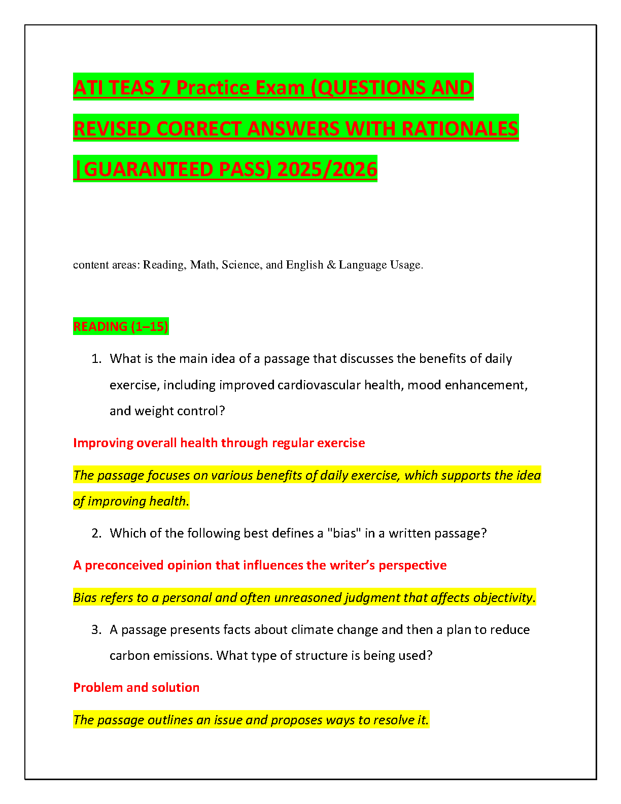 Unlock your potential and ace the ATI TEAS 7 exam on your first try with our comprehensive 2025/2026 test bank. This premium study resource, based on the official ATI curriculum, is packed with practice questions that mirror the actual exam format. It covers all essential content areas: Reading, Math, Science, and English & Language Usage. Each question comes with a revised correct answer and a detailed rationale, helping you understand the 'why' behind each solution. This method is proven to deepen your understanding and boost your confidence. Stop worrying about resits! This guide is your ultimate tool to study effectively, identify your weak spots, and walk into the exam fully prepared for success.