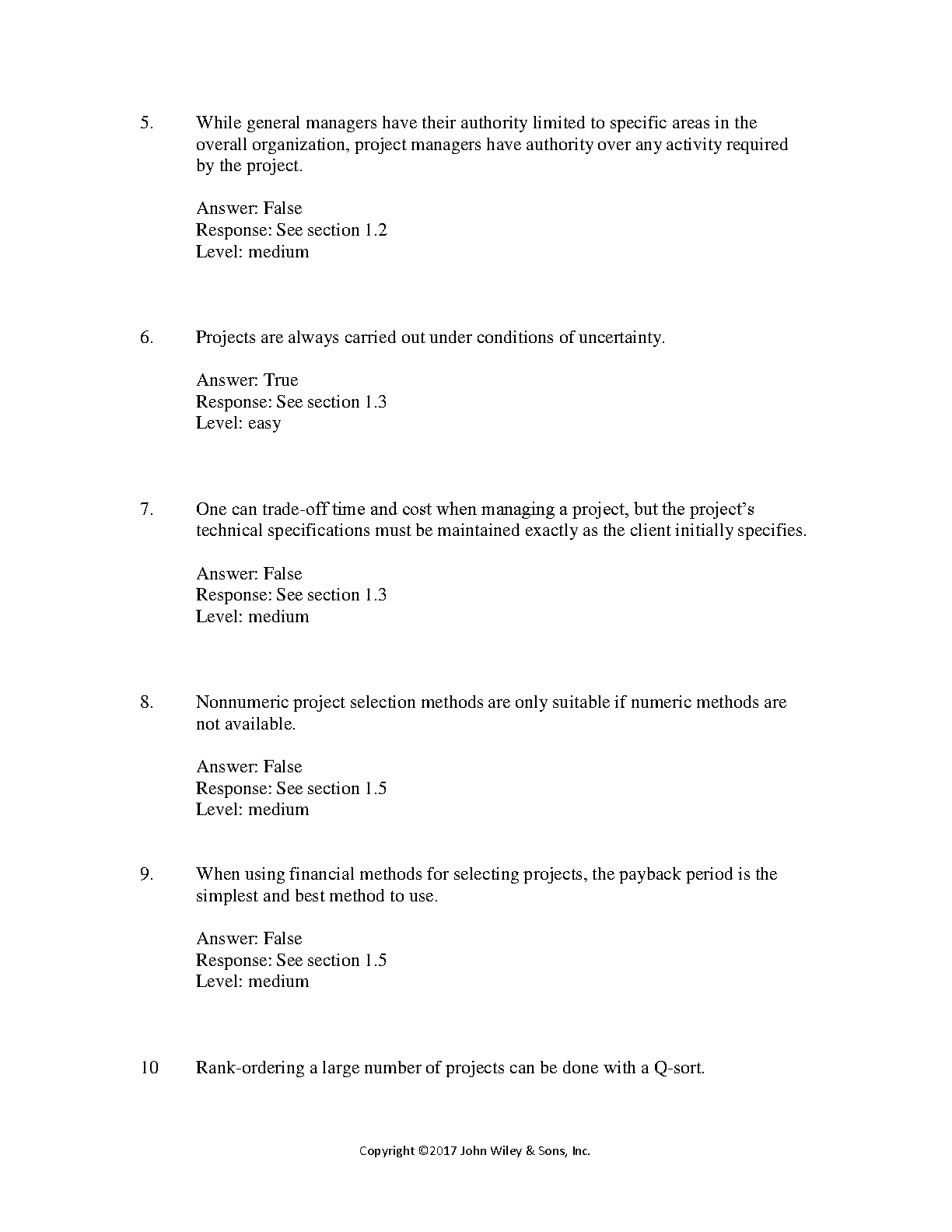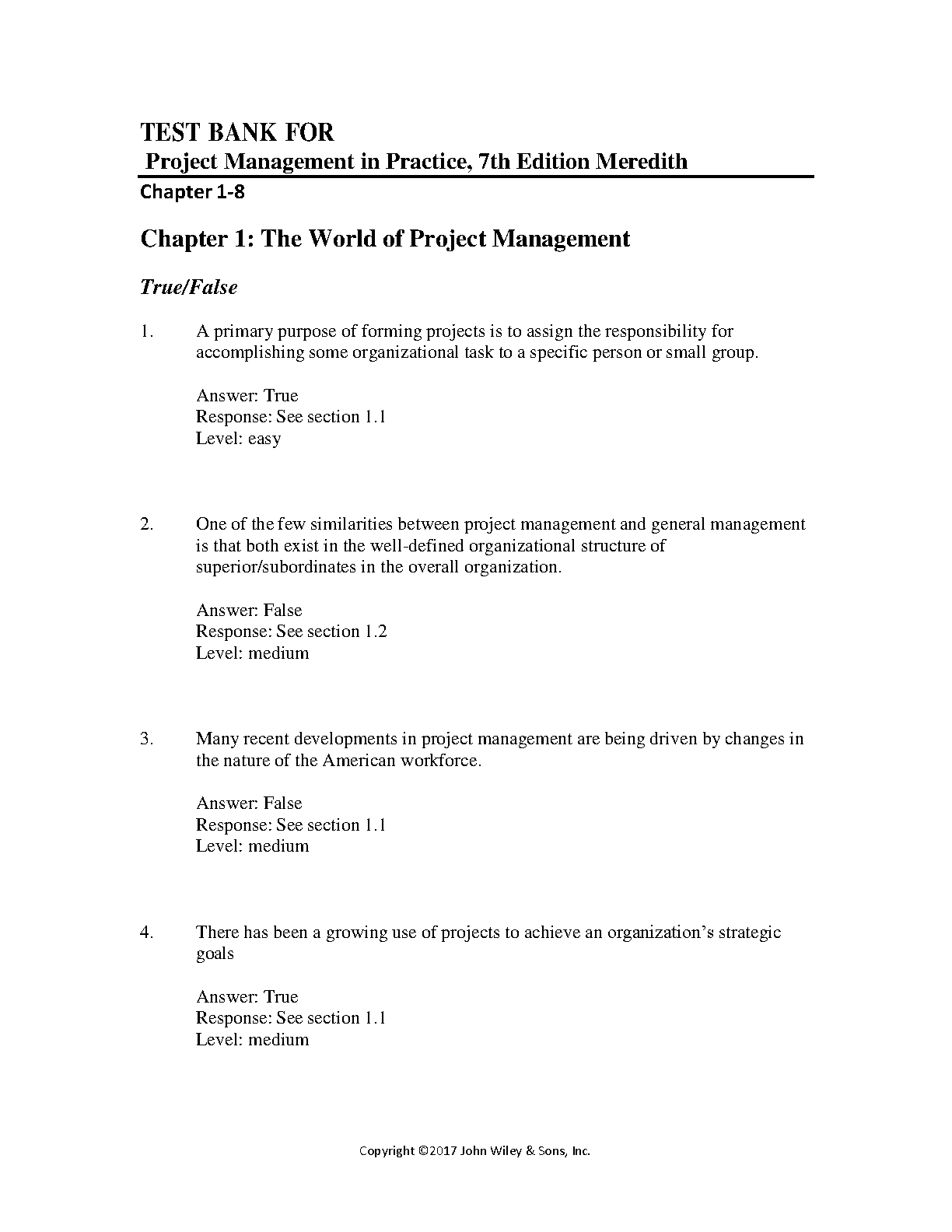 Master your project management course with this comprehensive Test Bank for 'Project Management in Practice, 7th Edition'. This essential study aid provides an extensive collection of exam-style questions, including True/False, multiple-choice, and short answer formats, covering all key concepts from chapters 1-8. Each question comes with a correct answer and detailed rationale, referencing specific sections in the textbook. It's the ultimate resource to test your knowledge, prepare for exams with confidence, and secure a top grade.