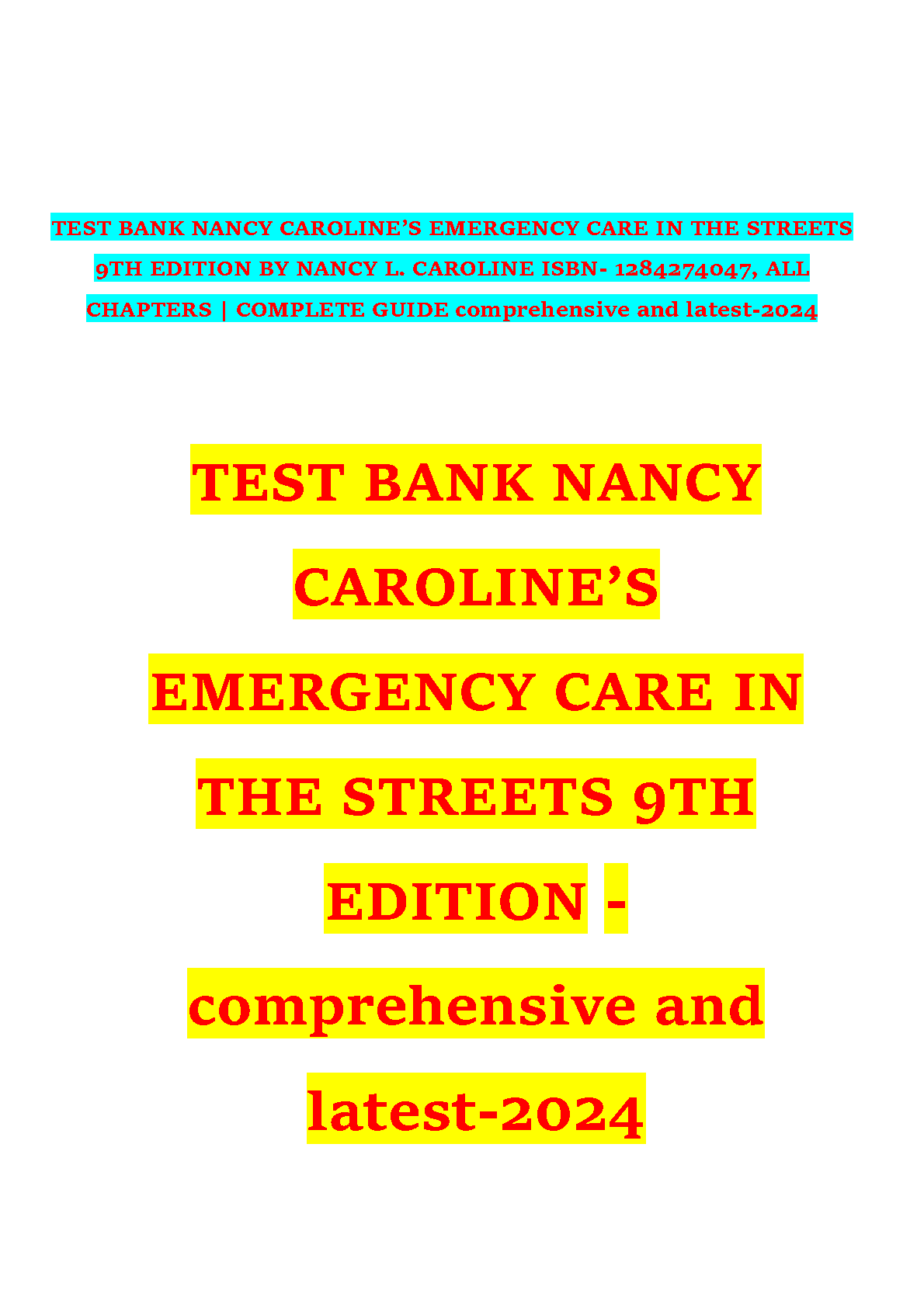 Unlock your full potential and excel in your emergency medical training with the official Test Bank for Nancy Caroline's Emergency Care in the Streets, 9th Edition. This comprehensive resource, updated for 2024, provides a complete collection of questions and answers covering every chapter of the textbook. Designed to mirror real exam scenarios, this guide is essential for students aiming to master critical concepts, test their knowledge, and achieve top grades. ISBN: 9781284274047.