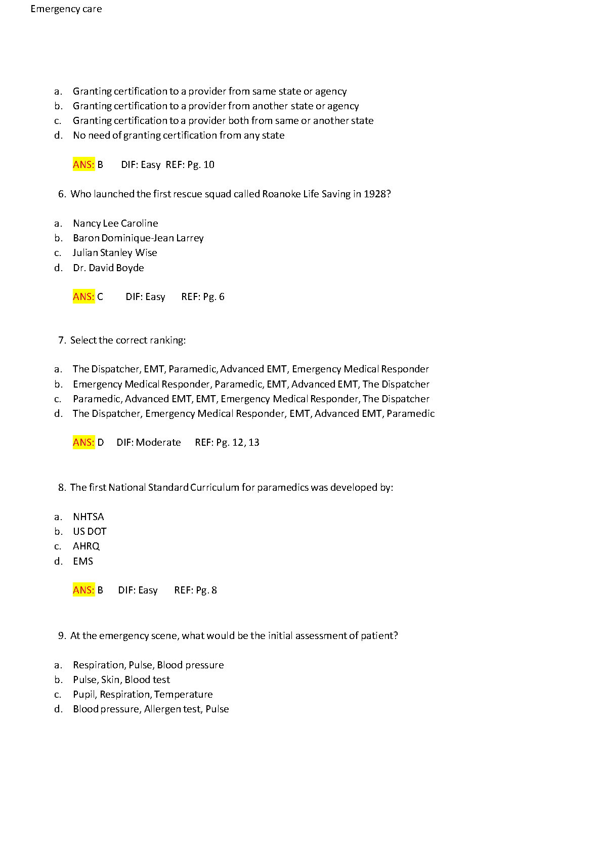 Test Bank for Nancy Caroline's Emergency Care in the Streets, 9th Edition by Nancy L. Caroline, Andrew N. Pollak