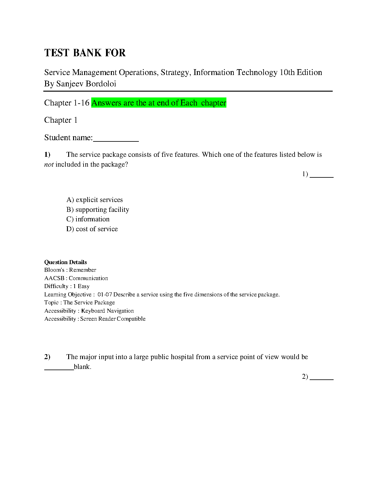 Test Bank for Service Management: Operations, Strategy, Information Technology, 10th Edition by Sanjeev K. Bordoloi, James A. Fitzsimmons, and Mona J. Fitzsimmons