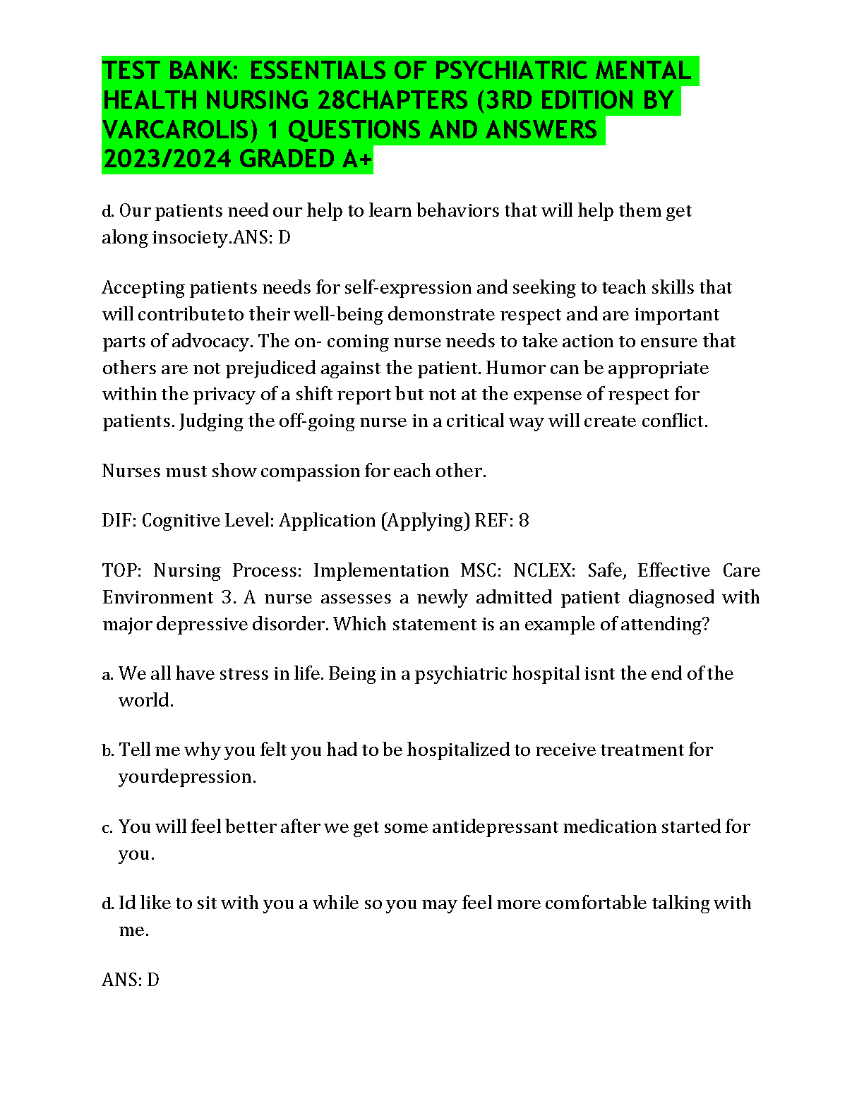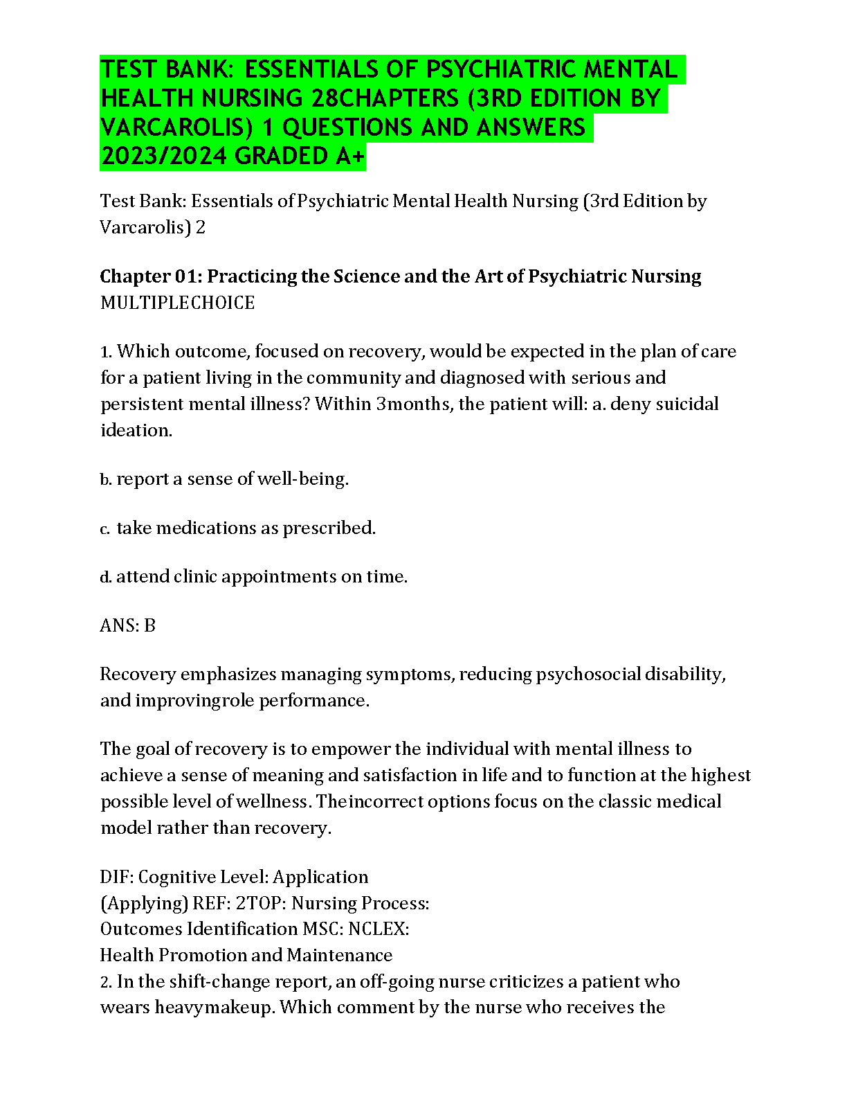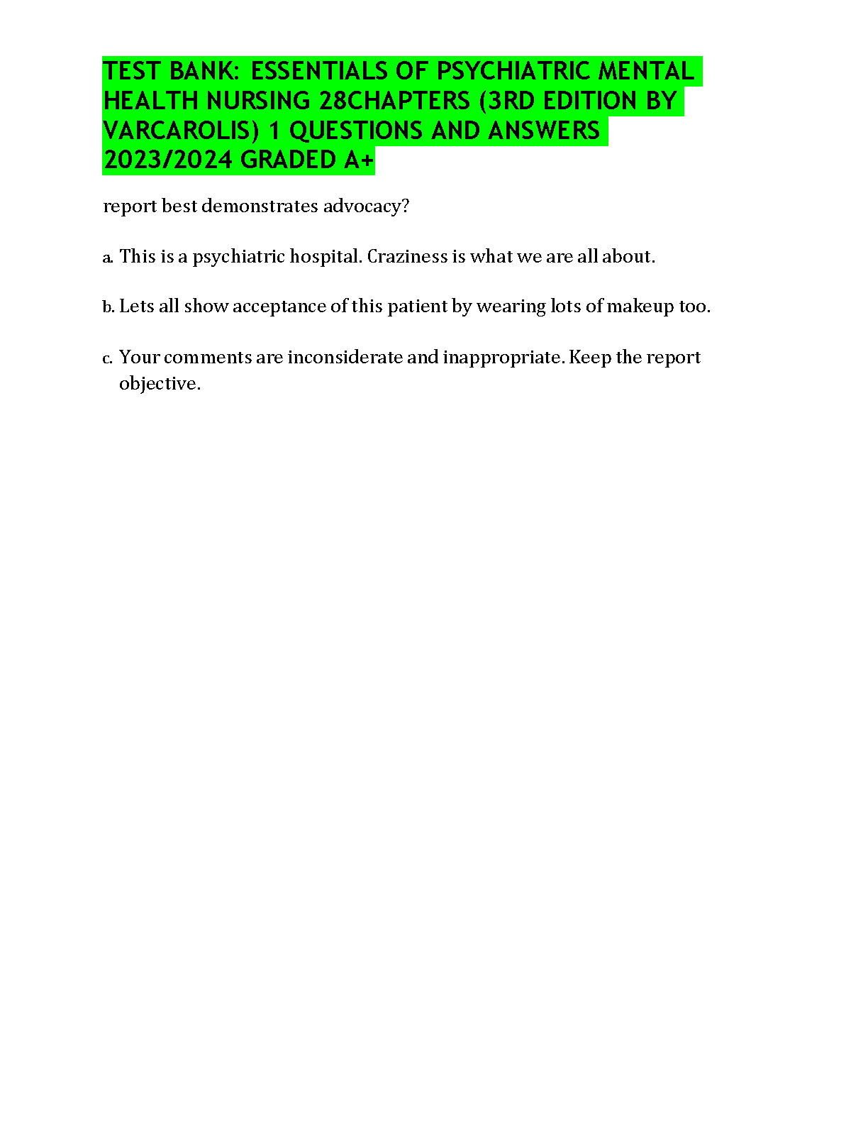 Unlock success in your psychiatric nursing course with the official Test Bank for the 3rd Edition of Essentials of Psychiatric Mental Health Nursing by Morgan and Varcarolis. This comprehensive resource covers all 28 chapters, providing an extensive collection of exam-style questions paired with detailed, verified answers and rationales. It's the ultimate study companion designed to help you master key concepts, prepare effectively for exams, and achieve top grades. Boost your confidence and ensure you pass on your first attempt with this essential learning tool.