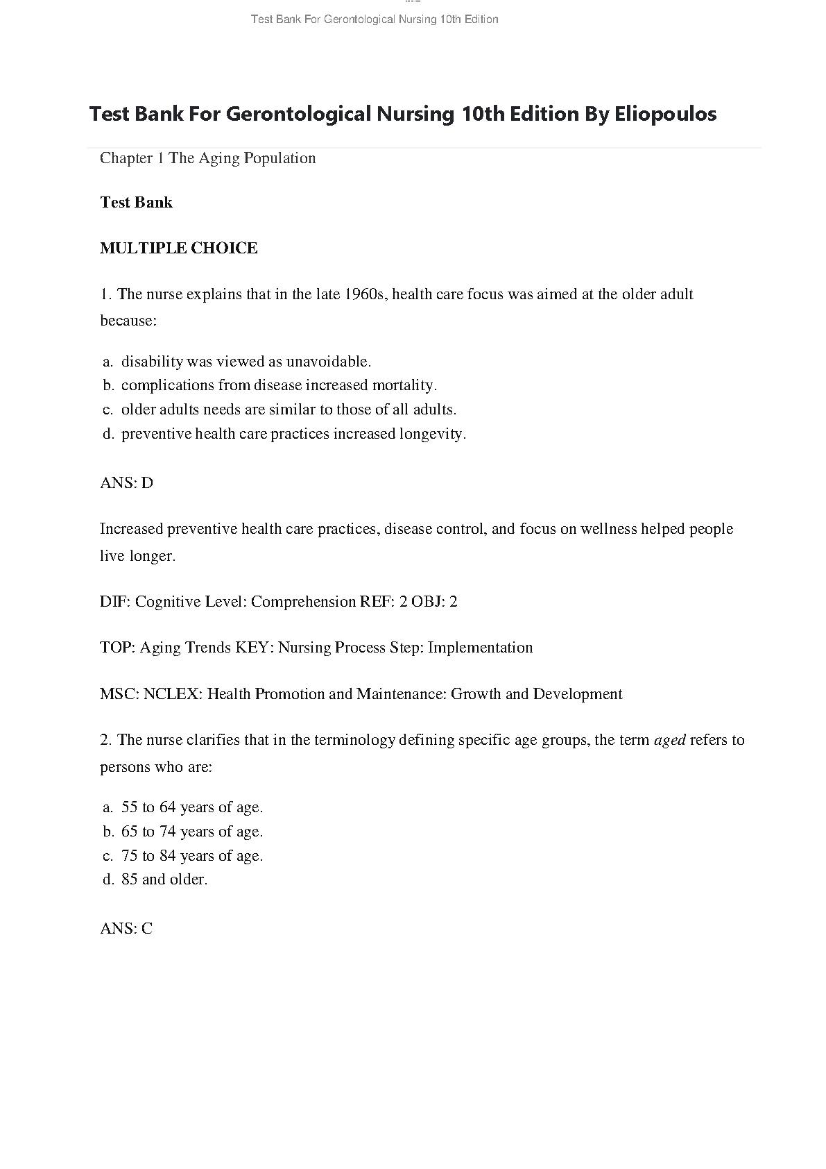 Master the complexities of elder care with the official Test Bank for 'Gerontological Nursing,' 10th Edition by Charlotte Eliopoulos. This comprehensive resource is packed with hundreds of practice questions, complete with detailed answers and rationales, covering every chapter of the textbook. Designed to help nursing students ace their exams, this test bank allows you to test your knowledge, identify areas for improvement, and build confidence. Get immediate access to a wide range of question types, including multiple-choice and critical thinking, to ensure you're fully prepared for course assessments.