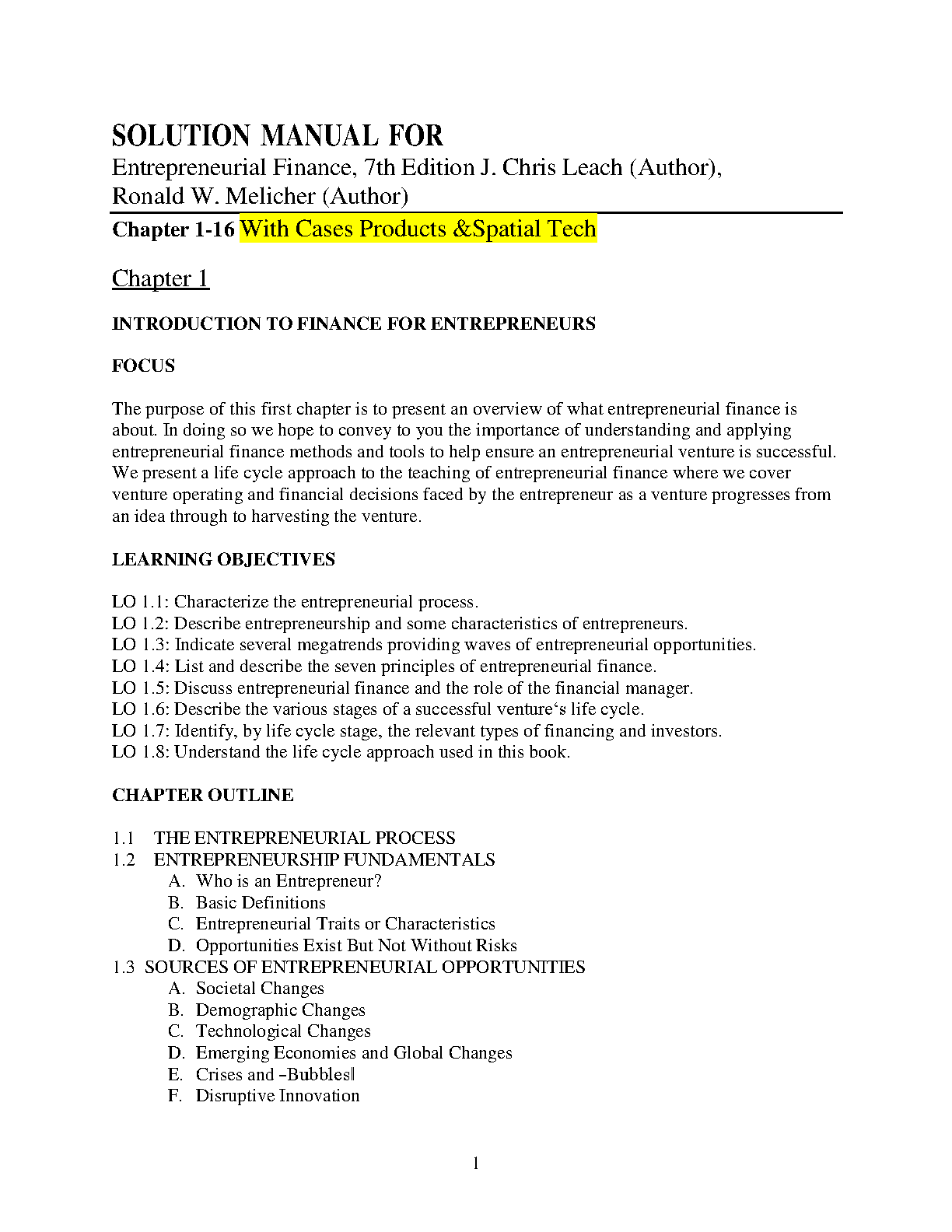 Solution Manual for Entrepreneurial Finance, 7th Edition by J. Chris Leach & Ronald W. Melicher (Chapters 1-16)