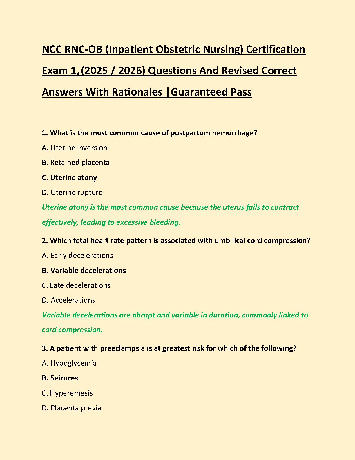 Master the NCC RNC-OB (Inpatient Obstetric Nursing) Certification Exam with this newly released 2025/2026 study guide. This comprehensive test bank features an extensive collection of exam-style questions, each accompanied by a revised, correct answer and a detailed rationale. Designed to ensure you pass on your first attempt, this resource covers all critical topics, helping you understand the reasoning behind each answer and build the confidence needed to excel. Avoid resits and fast-track your certification with this essential preparation tool.