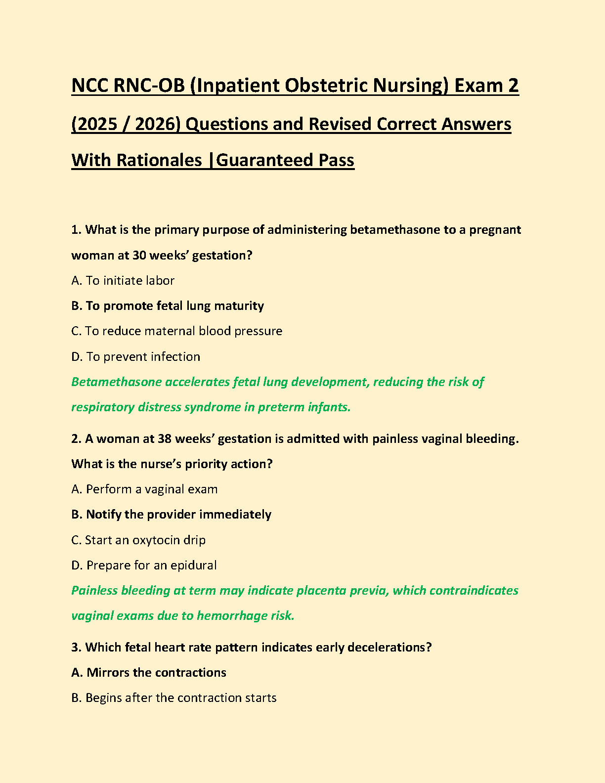 Master the NCC RNC-OB (Inpatient Obstetric Nursing) Exam 2 with our comprehensive 2025/2026 test bank. This essential study guide features a complete collection of updated questions, meticulously revised correct answers, and in-depth rationales for each topic. Designed to mirror the actual exam format, this resource helps you build confidence and master critical concepts in obstetric nursing. Prepare effectively, understand the reasoning behind each answer, and walk into your certification exam ready to pass on your first attempt. Your success is guaranteed!