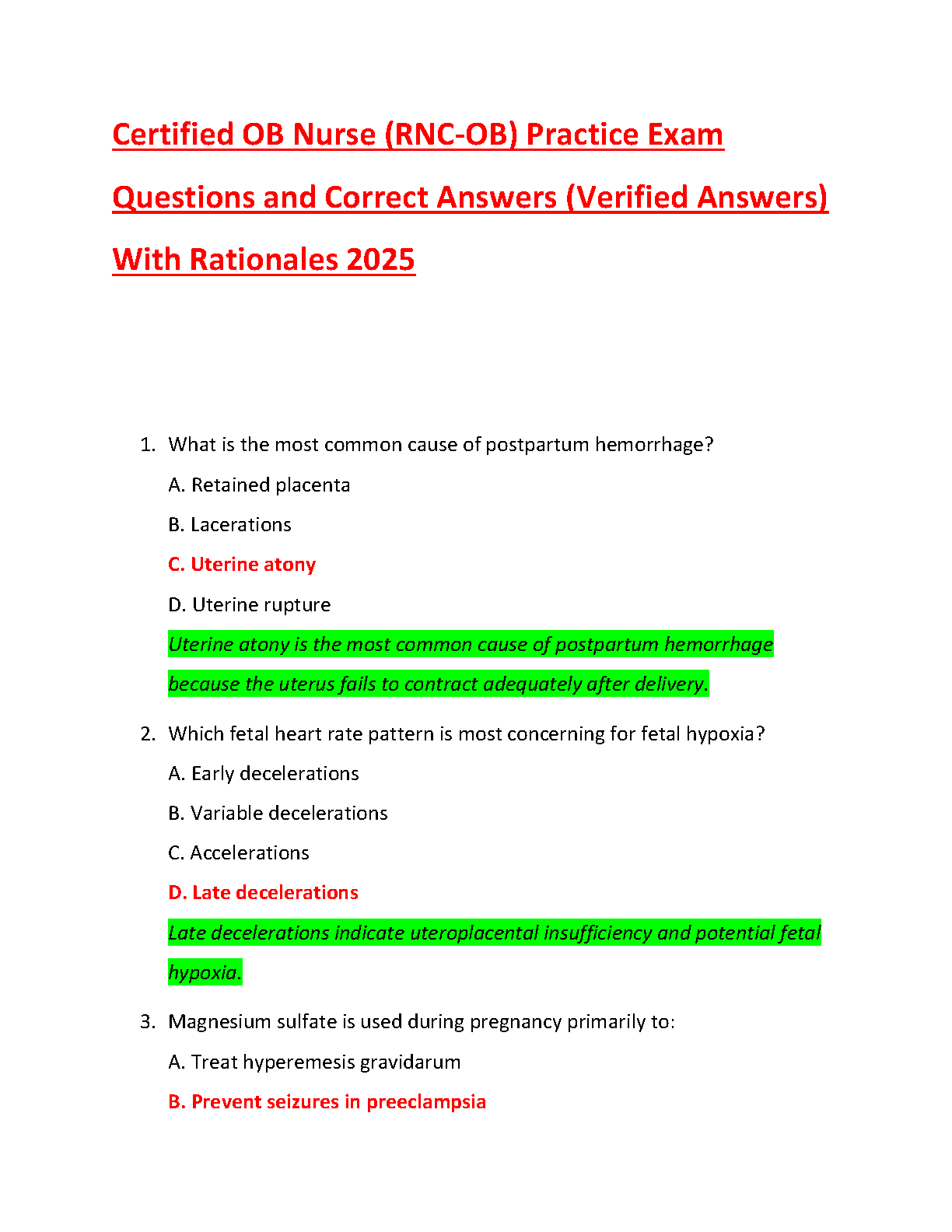 Certified OB Nurse (RNC-OB) Test Bank 2025/2026: Comprehensive Q&A with Rationales to Pass on Your First Try