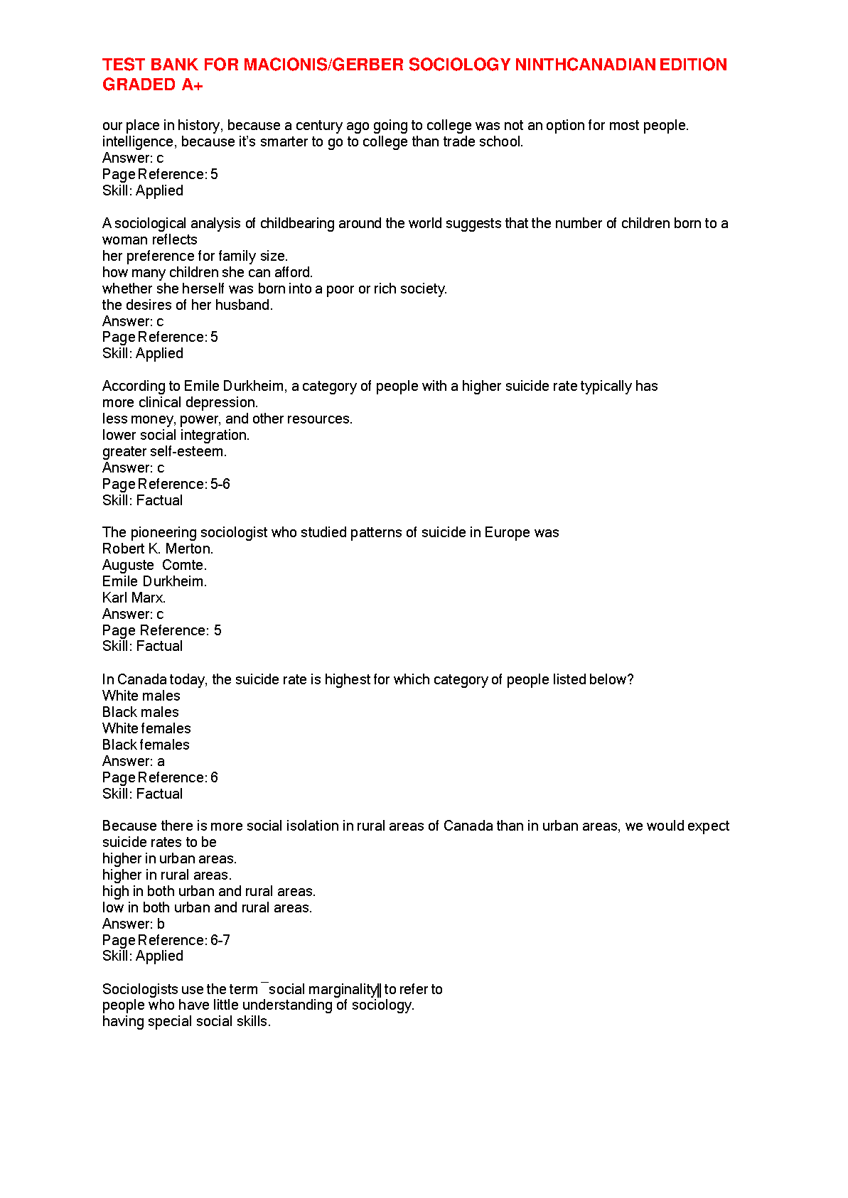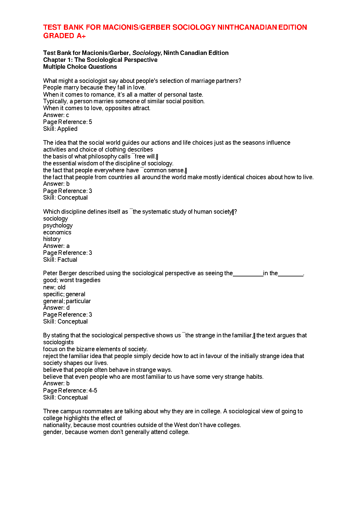 Test Bank for Sociology, Ninth Canadian Edition by John J. Macionis and Linda M. Gerber