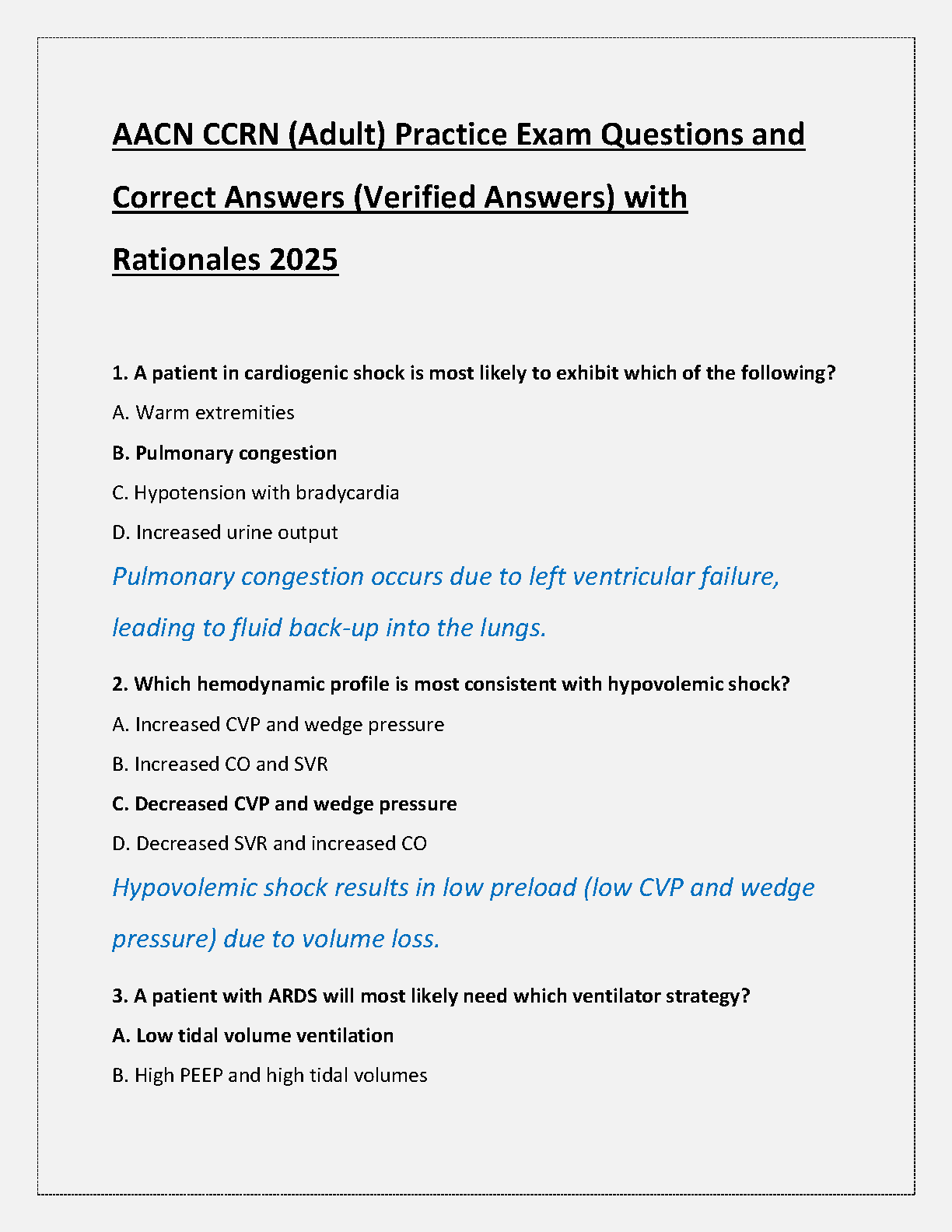 Latest 2025 AACN CCRN (Adult) Test Bank | Verified Practice Exam Questions and Answers with Rationales