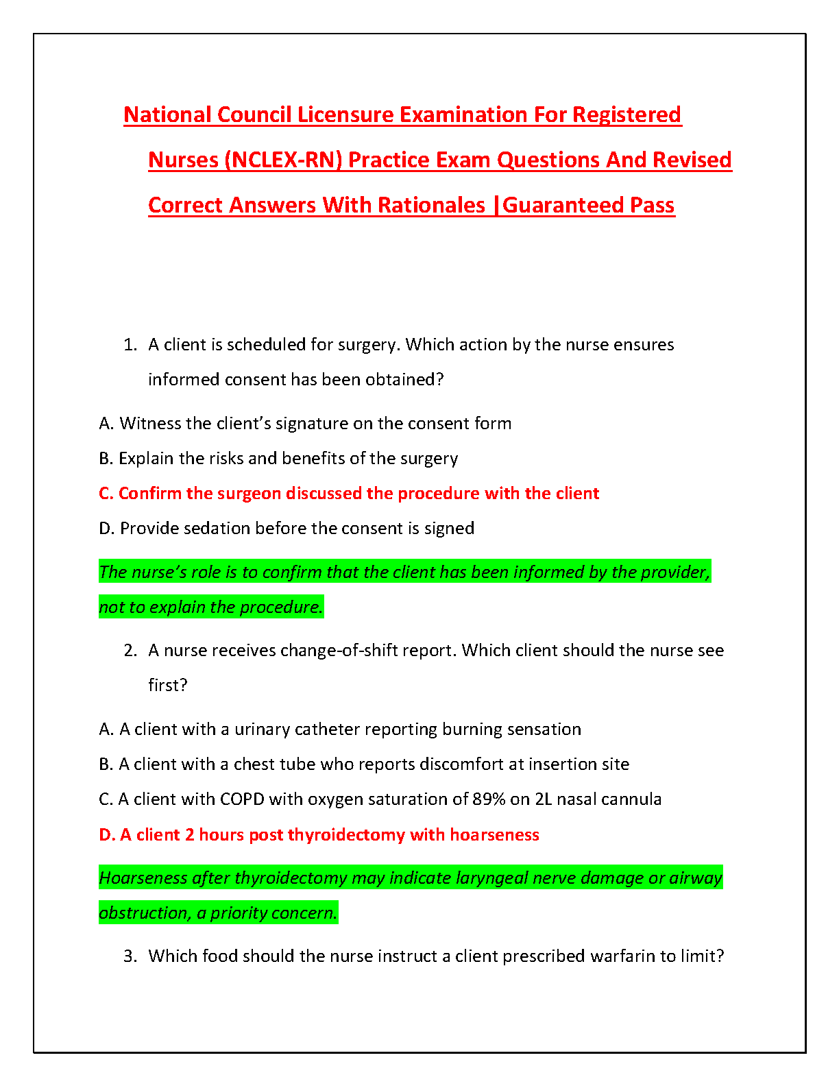 Unlock your nursing career potential with our latest 2025/2026 NCLEX-RN Test Bank. This essential study guide is packed with practice exam questions meticulously designed to mirror the actual test format. Each question comes with a revised, correct answer and a detailed rationale, explaining the 'why' behind the right choice. This resource is your key to mastering complex nursing concepts, honing your critical thinking skills, and walking into the exam with the confidence to pass on your very first attempt. Avoid resits and start your nursing journey sooner with this guaranteed-pass study tool.