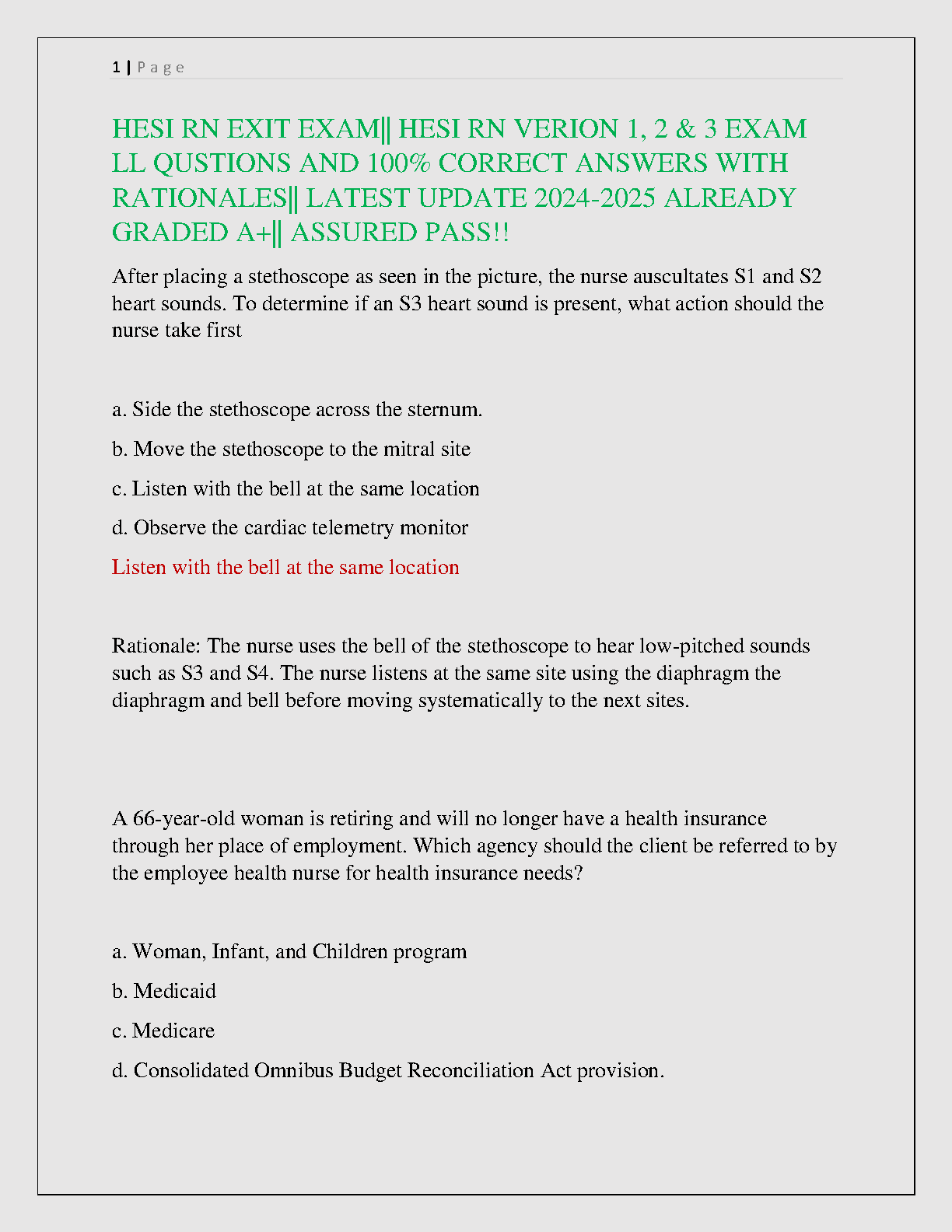 Ace your HESI RN Exit Exam on the first try with our ultimate 2024-2025 Test Bank. This comprehensive study guide covers Versions 1, 2, and 3, providing a complete collection of questions with 100% correct, verified answers and in-depth rationales. Designed for nursing students aiming for an A+ grade, this resource explains the 'why' behind each answer, solidifying your understanding of key nursing concepts. Prepare effectively, boost your confidence, and ensure you pass your HESI RN Exit Exam with flying colors. Download now for immediate access to your path to success!