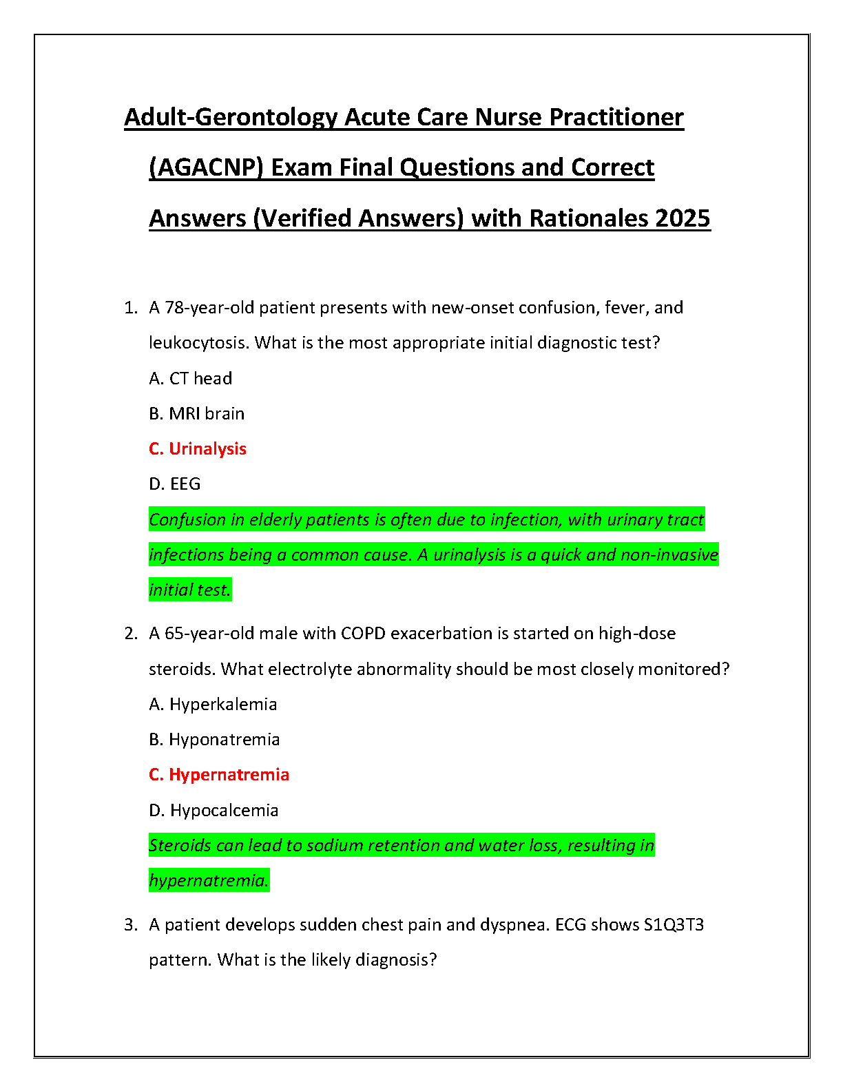 Ace your Adult-Gerontology Acute Care Nurse Practitioner (AGACNP) certification with our premier 2025 test bank! This comprehensive study guide is meticulously designed to help you pass on your very first attempt. Inside, you'll find a vast collection of exam-style questions, each paired with a 100% correct, verified answer and a detailed rationale. Unlike other study materials, our rationales explain the 'why' behind each answer, solidifying your understanding of complex clinical concepts. Prepare with confidence, master critical content, and walk into your AGACNP exam ready to succeed. Don't risk a resit—invest in the ultimate preparation tool for 2025!