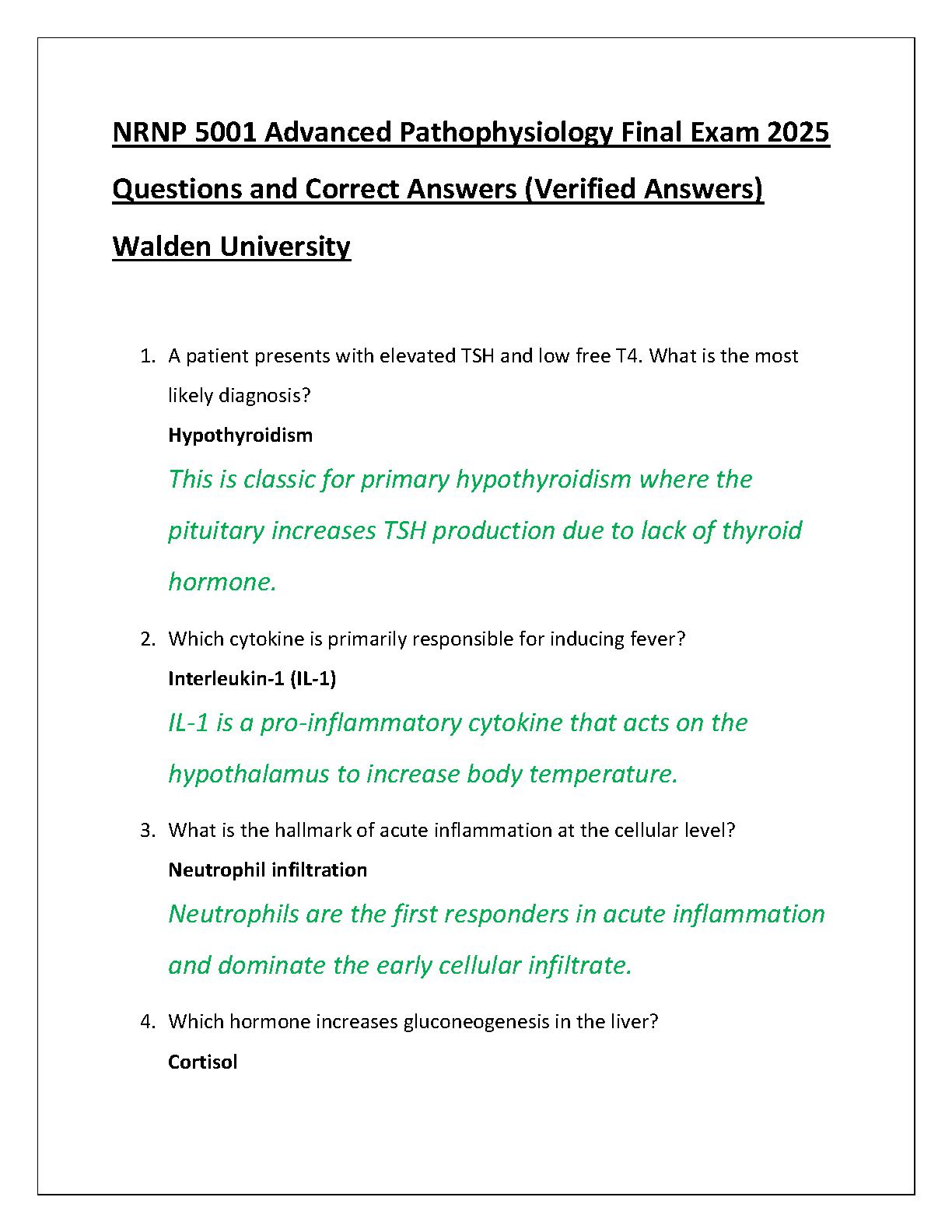Master your NRNP 5001 Advanced Pathophysiology final exam with our comprehensive study guide, fully updated for the 2025/2026 academic year. This essential resource from Walden University features a detailed collection of exam-style questions paired with verified, in-depth answers and rationales. Covering critical topics from endocrine system pathophysiology to the mechanisms of inflammation, this guide is designed to clarify complex concepts and ensure you are fully prepared. Boost your confidence and achieve a top grade on your first attempt, making exam resits a thing of the past.