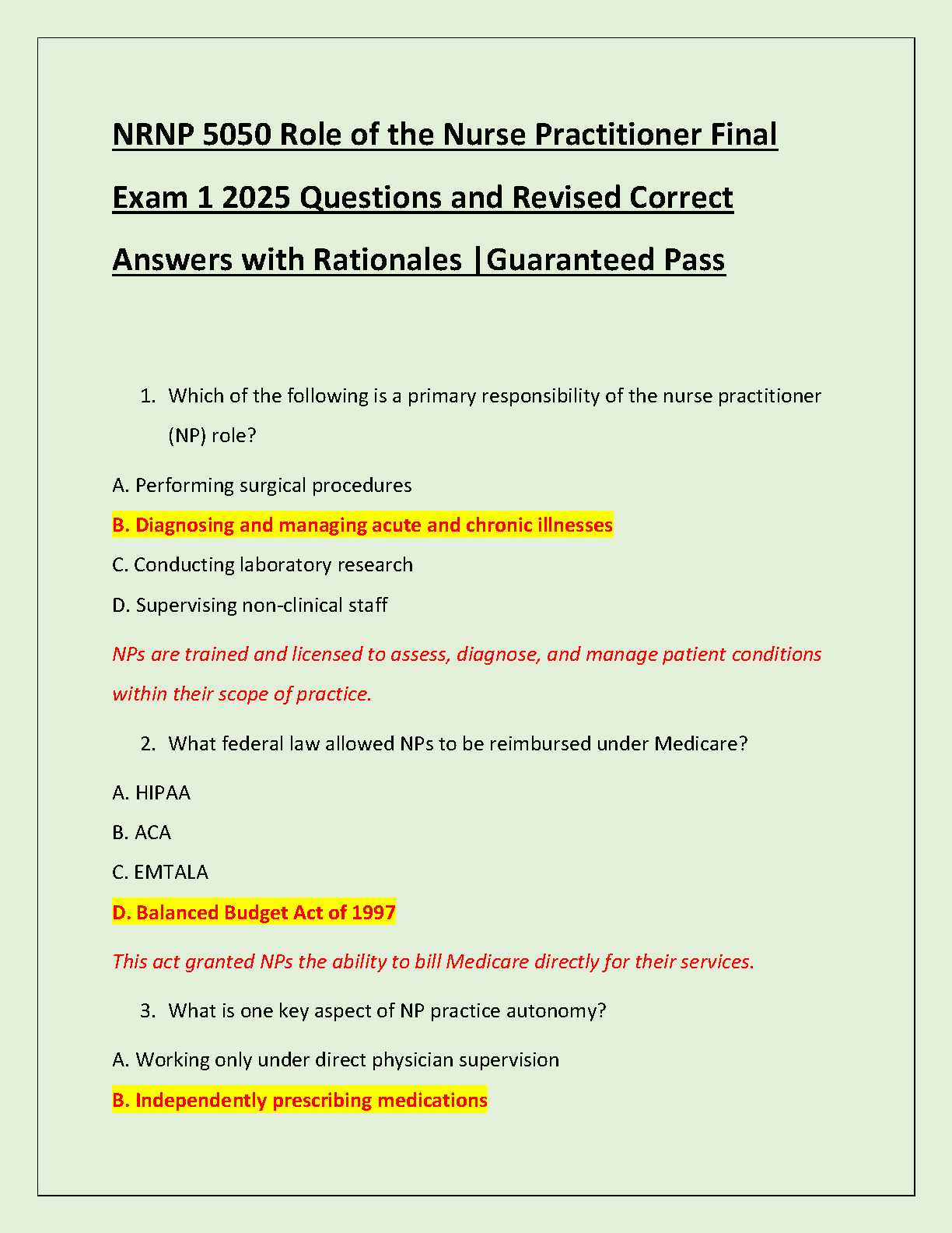 NRNP 5050 Role of the Nurse Practitioner Final Exam 1: 2025/2026 Edition with Updated Questions, Correct Answers & Detailed Rationales for a Guaranteed Pass