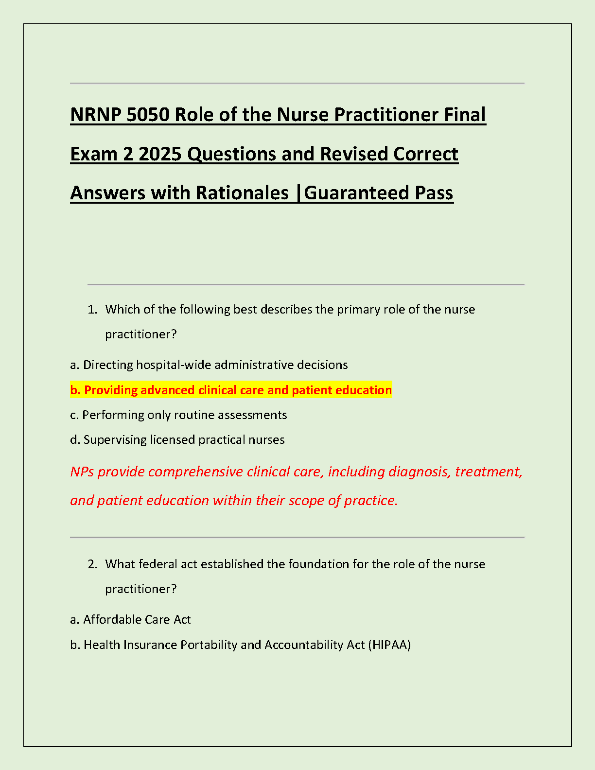 Unlock success in your NRNP 5050 course with our latest 2025/2026 Final Exam 2 Test Bank. This comprehensive study guide provides a complete set of questions meticulously compiled from the 'Role of the Nurse Practitioner' curriculum. Each question is paired with a verified correct answer and an in-depth rationale, designed to clarify complex concepts and solidify your understanding. Prepare effectively, boost your confidence, and pass your final exam on the first attempt with this essential resource.