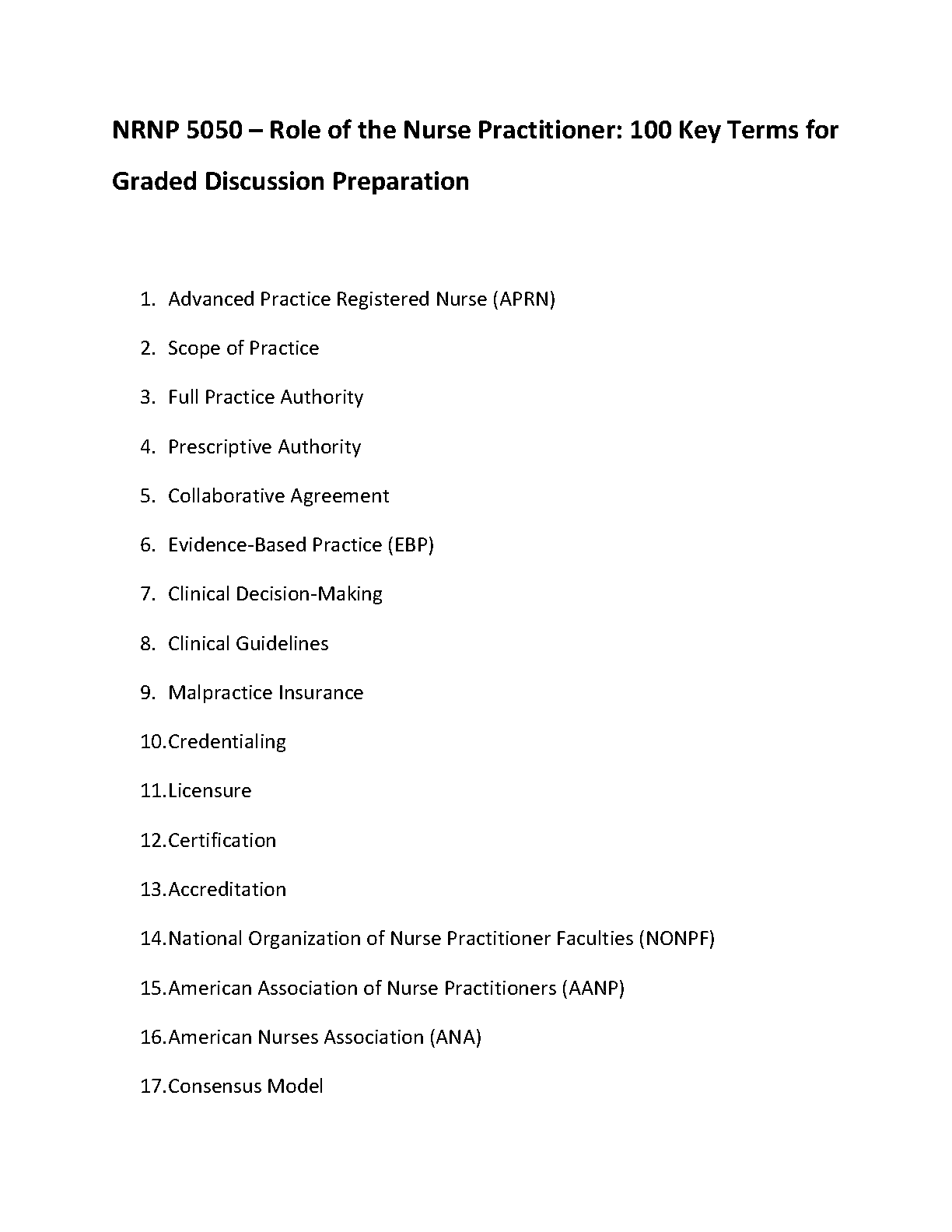 Unlock success in your NRNP 5050 course with this essential study guide, fully updated for the 2025/2026 academic year. This resource provides a detailed list of 100 key terms crucial for understanding the 'Role of the Nurse Practitioner.' Master fundamental concepts from APRN scope of practice to credentialing and malpractice insurance. This guide is expertly designed to help you excel in graded discussions and pass your exams on the first attempt, saving you from the stress of resits. Get the edge you need to succeed in your nursing career.
