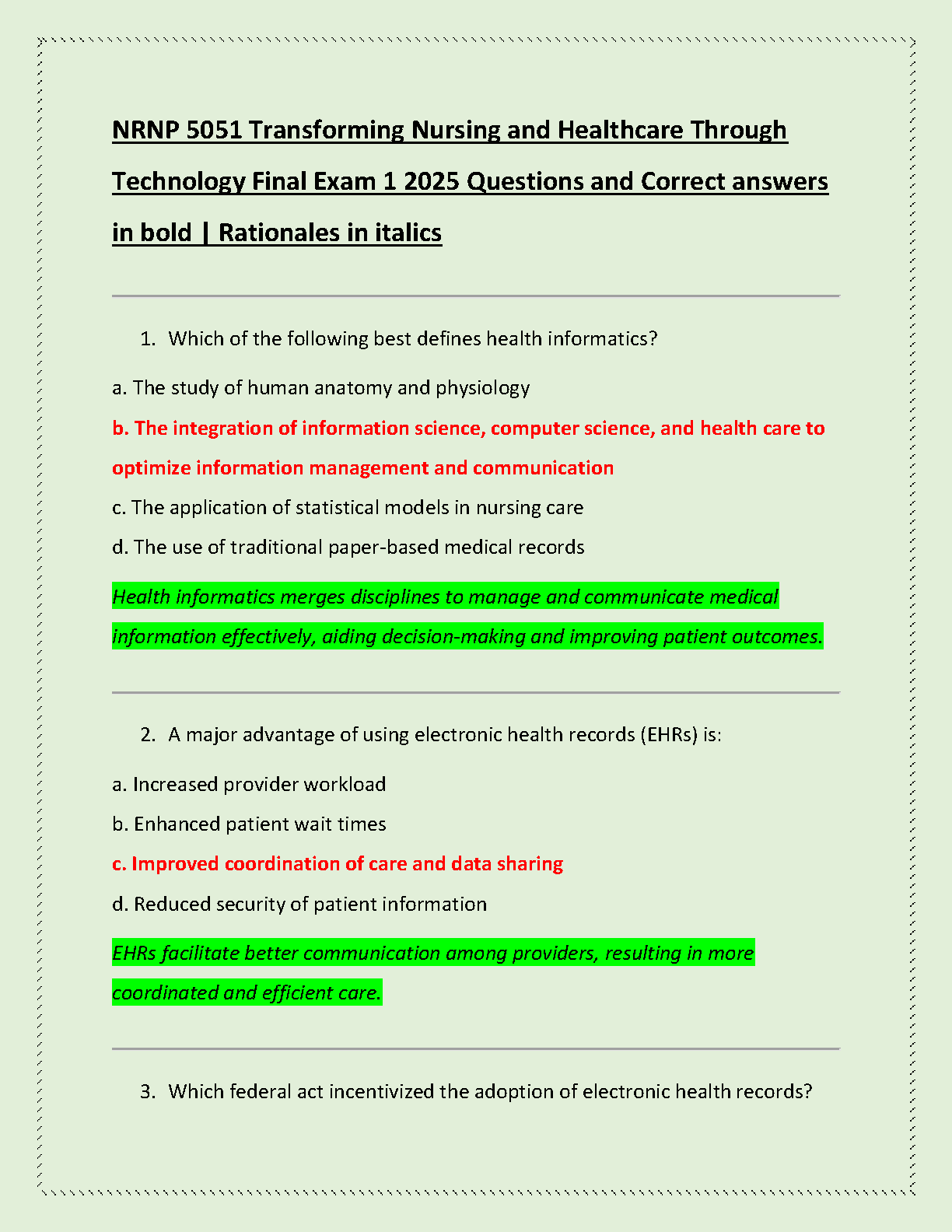 Ace your NRNP 5051 Final Exam with our comprehensive test bank for 'Transforming Nursing and Healthcare Through Technology,' 3rd Edition by Tiffany Kelley. This premium study guide, updated for the 2025-2026 academic year, features a complete collection of final exam questions, each with a verified correct answer and a detailed rationale to explain the concepts. Master topics like health informatics, EHRs, and healthcare technology to pass your exam on the first try. Download now for immediate access to the ultimate study resource and secure your success!
