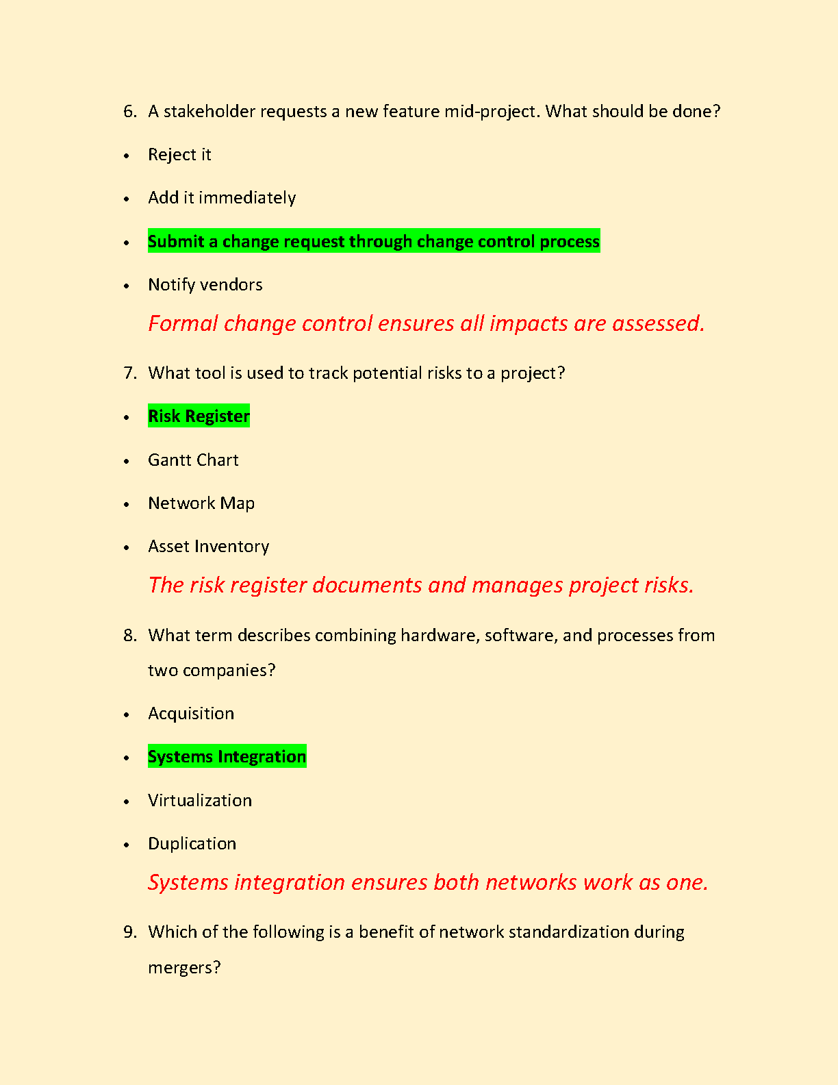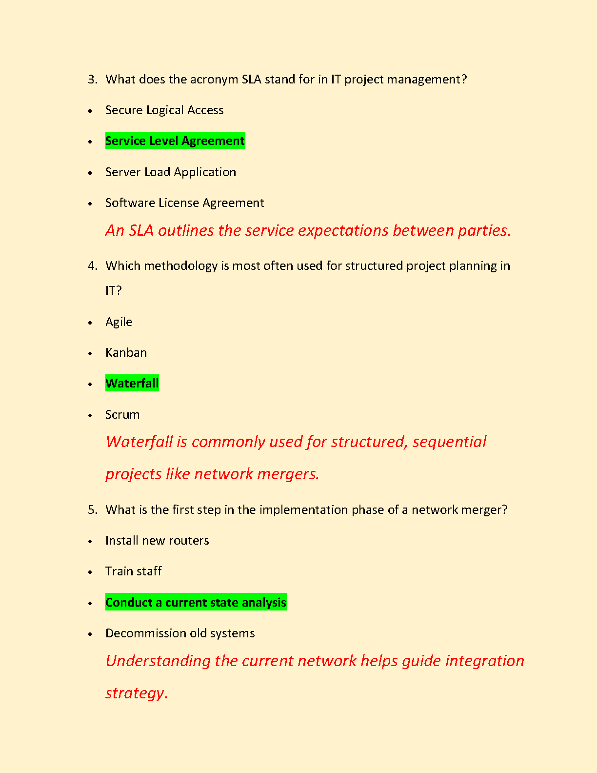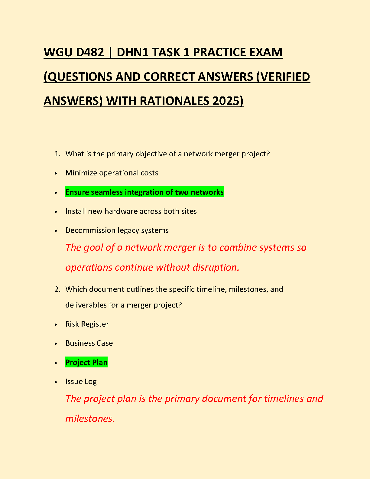 Master the WGU D482 Network and Security - Foundations course with our latest 2025/2026 test bank for DHN1 Task 1. This comprehensive study guide provides a complete set of practice exam questions, each with a verified correct answer and detailed rationale to ensure you grasp the core concepts. Designed to help you pass on your first attempt, this resource covers key topics like network mergers and project management. Avoid resits and achieve success with our expertly prepared materials.