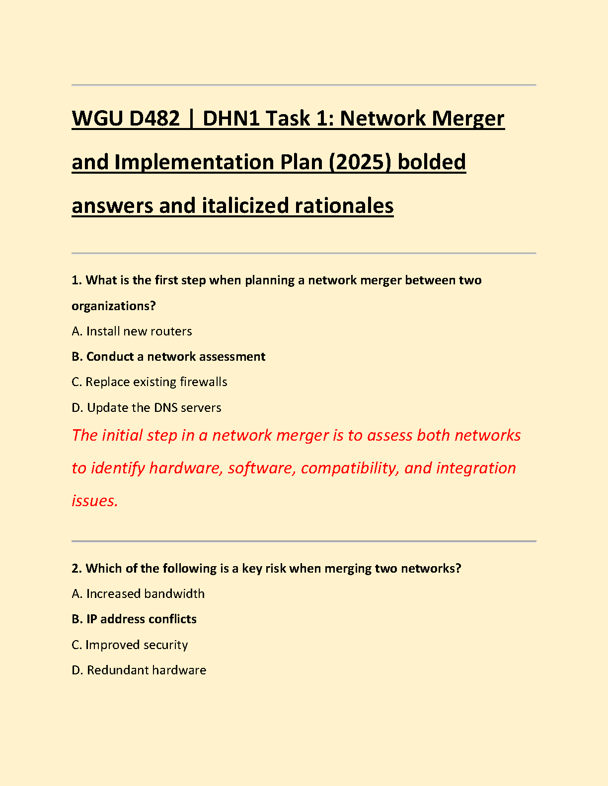 Unlock success in your WGU studies with this comprehensive guide for D482 / DHN1 Task 1: Network Merger and Implementation Plan. This up-to-date 2025/2026 resource provides a complete set of questions with clearly bolded answers and in-depth, italicized rationales. Master the key concepts of network assessment, risk management, and implementation strategies to complete your task confidently and pass on your first attempt. Avoid resits and accelerate your degree progress with this essential study aid.