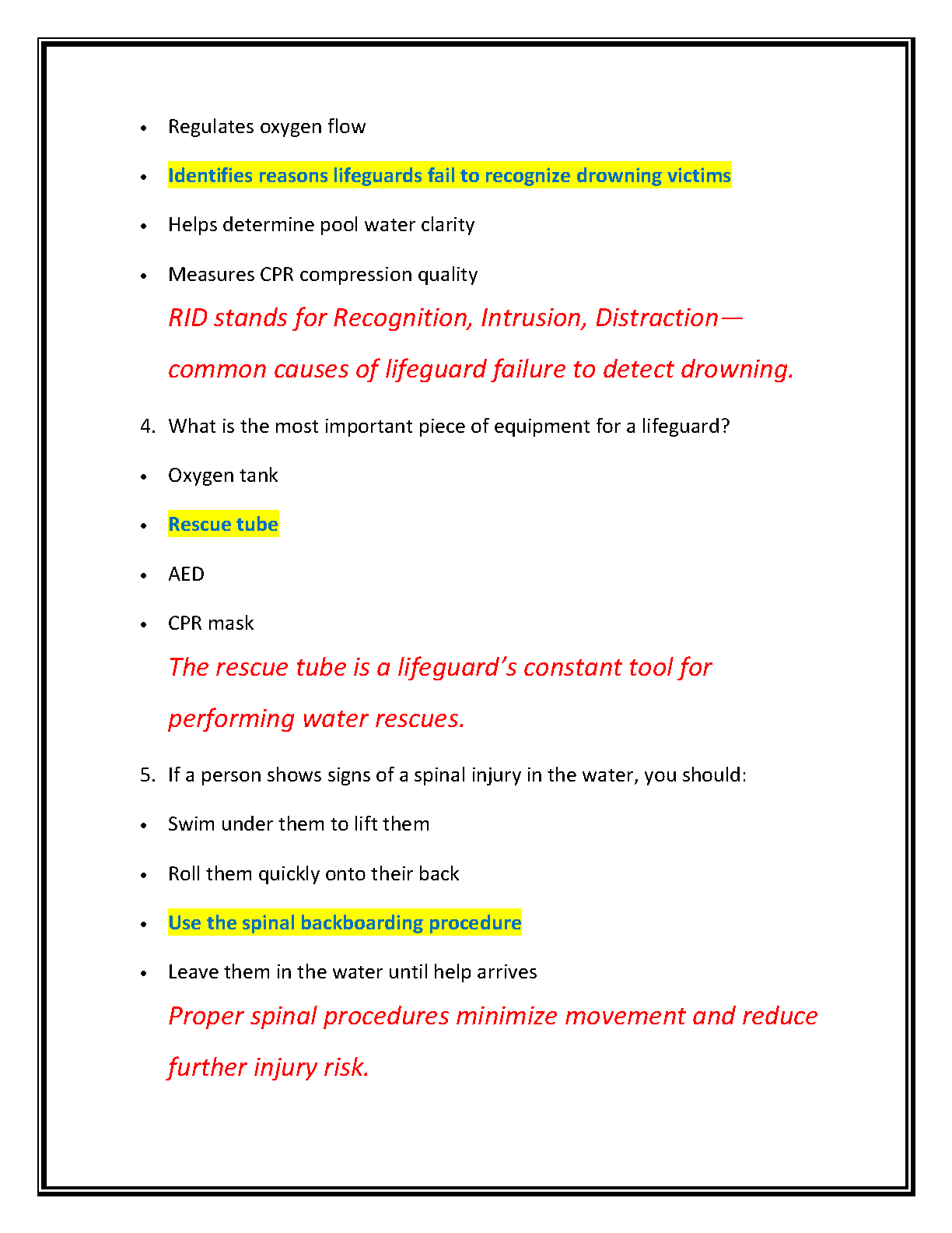Dive into your lifeguard certification with confidence using the ultimate study resource for the StarGuard ELITE (SGE) exam. Our newly updated 2025/2026 Test Bank is expertly crafted to ensure you pass on your first attempt, eliminating the need for costly resits. This comprehensive guide features a complete collection of real exam questions, complete with detailed, verified answers and explanations. Master key concepts such as the primary responsibilities of a lifeguard, the critical SGE 10/20 protection standard, the RID Factor, and all essential emergency response protocols. Each question is designed to mirror the actual test format, providing you with the practice and knowledge needed to achieve a 100% pass score. Download now and become a certified SGE lifeguard with ease!