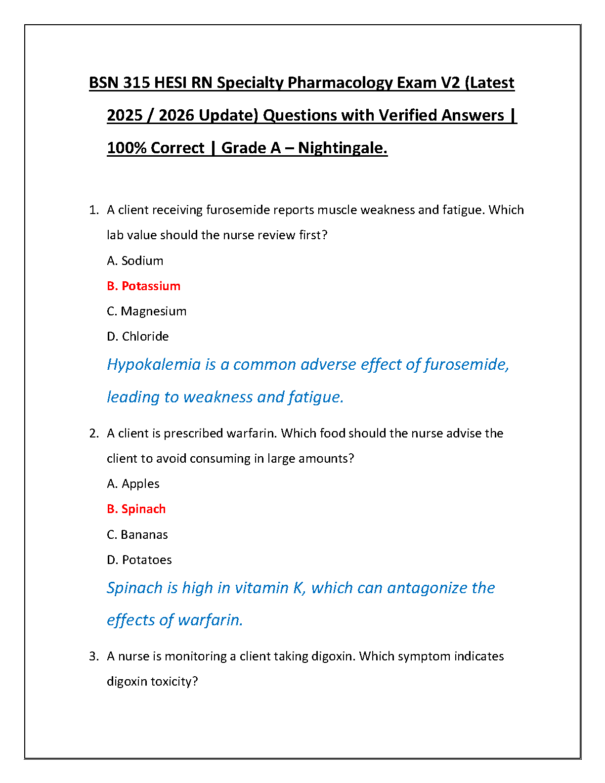 Master your nursing pharmacology course with the latest BSN 315 HESI RN Specialty Pharmacology Exam V2 Test Bank. This comprehensive study guide, updated for the 2025/2026 academic year, is meticulously designed to help you ace your exam on the first try. It features a complete set of practice questions covering crucial topics, each with verified answers and detailed rationales for better understanding. Prepare effectively, build your confidence, and secure a Grade A with this essential resource.