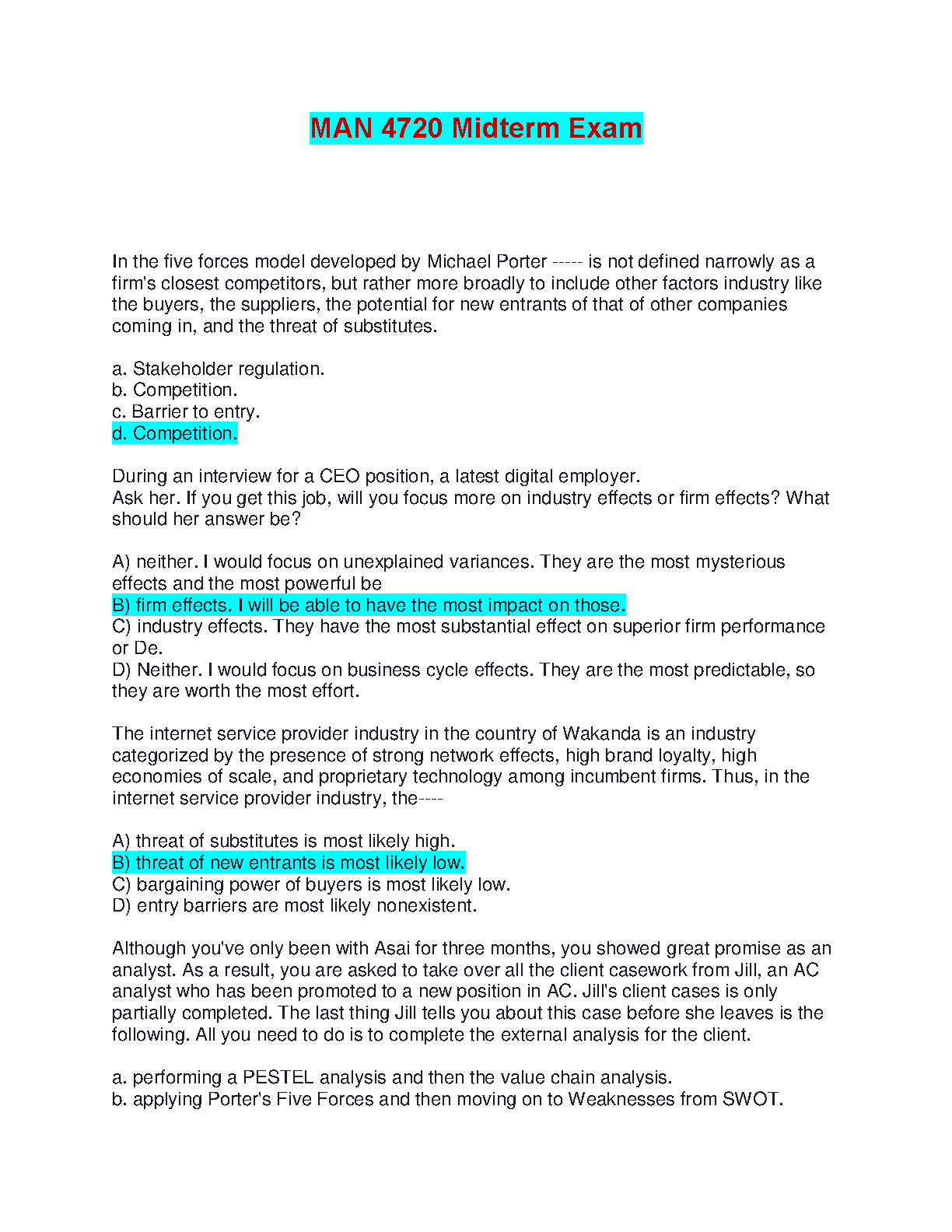 Unlock success in your Strategic Management course with our exclusive test bank for the MAN 4720 Midterm Exam. Tailored to the 5th Edition of Frank T. Rothaermel's 'Strategic Management,' this guide is your key to mastering complex concepts. Inside, you'll find a curated selection of actual exam-style questions, complete with verified answers, focusing on critical areas like Porter's Five Forces, industry analysis, and PESTEL. Stop guessing and start studying effectively. This is the perfect resource to boost your confidence, ensure you pass on your first try, and excel in your course.