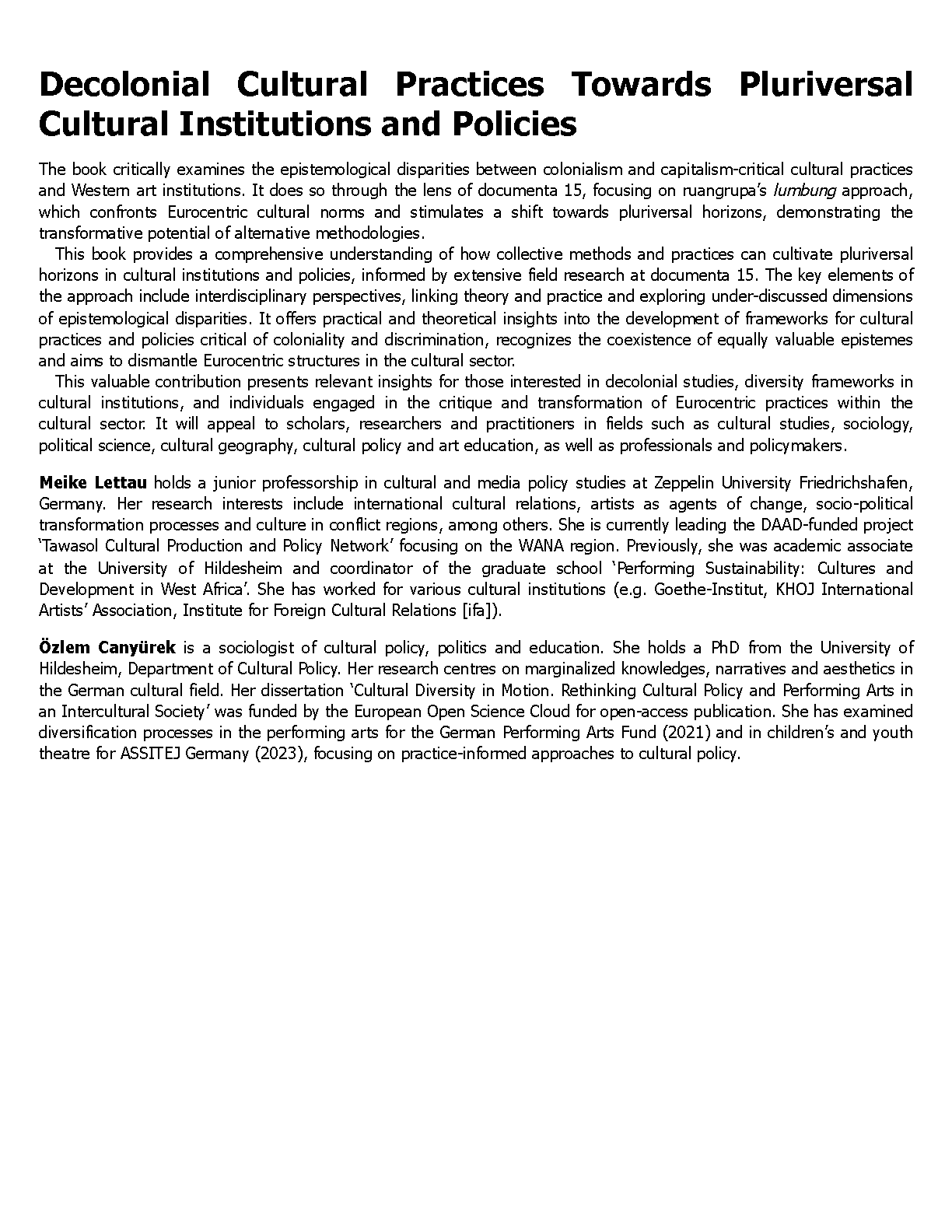Unlock academic excellence with our premier study resource for 'Decolonial Cultural Practices,' edited by Meike Lettau and Özlem Canyürek. This guide, fully updated for the 2025/2026 academic year, offers a deep dive into decolonial approaches to culture and policy. It synthesizes insights from practitioners, activists, and scholars, focusing on the concept of pluriversal cultural institutions. Our comprehensive notes and elaborations are designed to help you master complex topics, excel in your coursework, and pass your exams with confidence on the very first try. Avoid resits and secure top grades with this essential study companion.