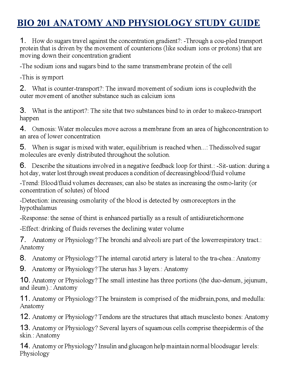 Struggling with BIO 201 Anatomy and Physiology? This comprehensive study guide for the 2025/2026 academic year is your key to success. Dive deep into essential topics with our detailed Q&A format, covering everything from cellular transport mechanisms like symport and counter-transport to complex homeostatic processes such as the negative feedback loop for thirst. Clearly distinguish between anatomy and physiology with practical examples. This resource is meticulously crafted to help you grasp core concepts, excel in your exams, and pass on your very first attempt, eliminating the need for costly and stressful resits.