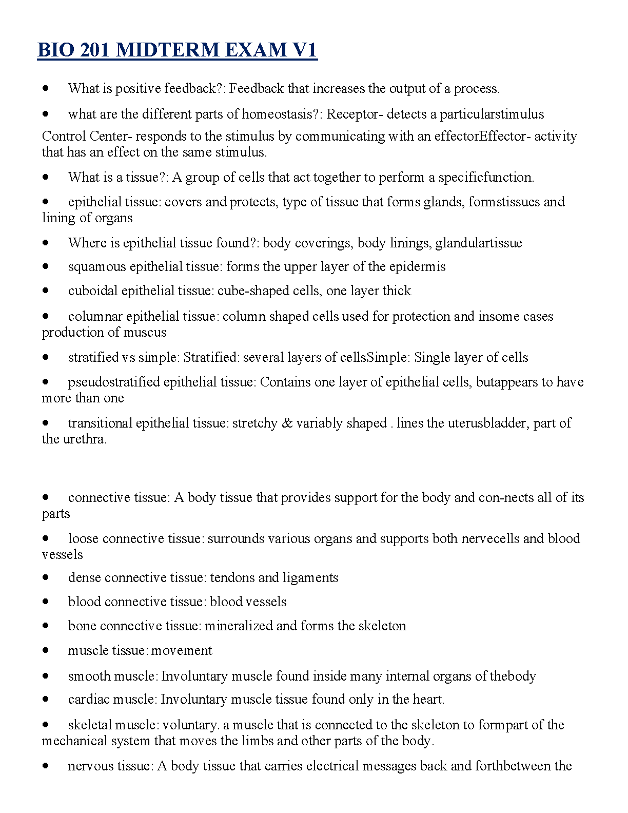 Unlock success in your BIO 201 course with our meticulously crafted Midterm Exam Elaboration (V1) for the 2025/2026 academic year. This comprehensive study guide provides in-depth, easy-to-understand answers to crucial exam questions. Master fundamental concepts including positive feedback, homeostasis, and the detailed classification of tissues—from epithelial and connective to muscle and nervous tissue. This resource is expertly designed to streamline your study process, clarify complex topics, and ensure you pass your midterm exam with confidence on the very first attempt.