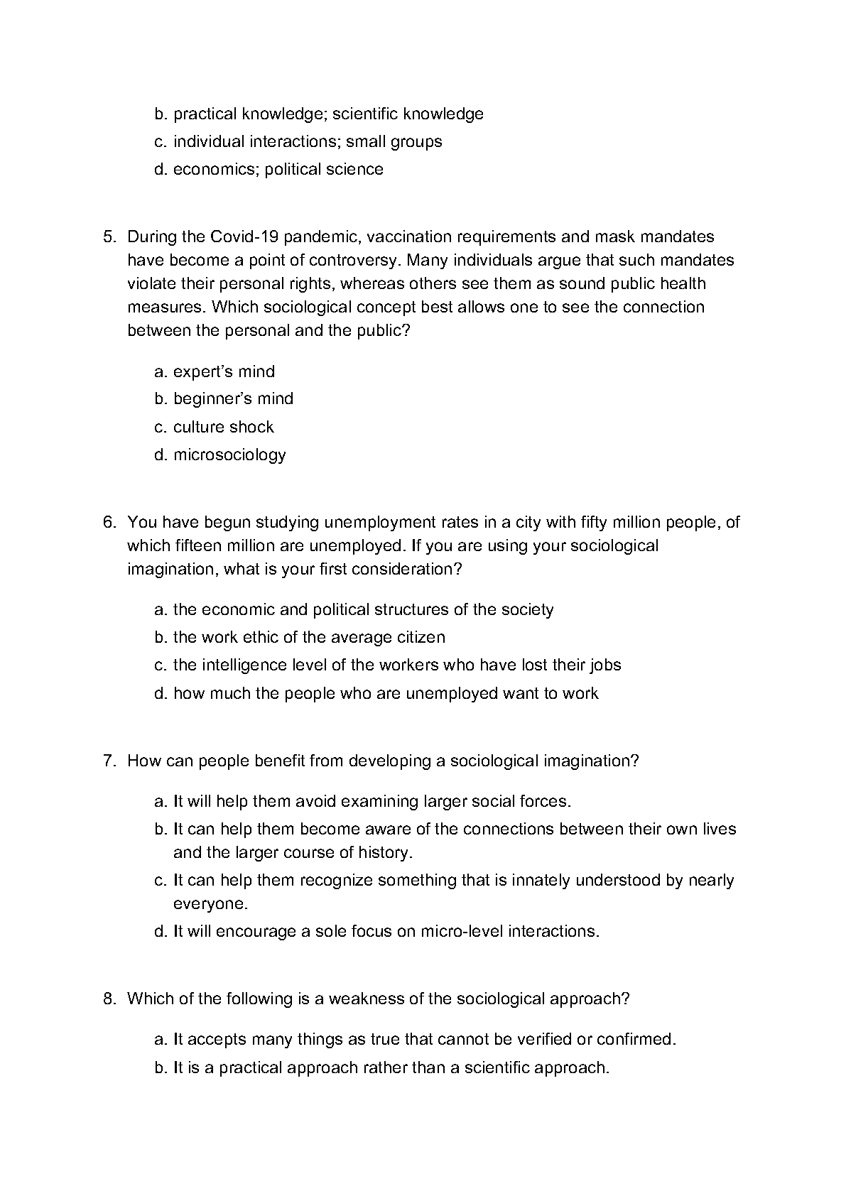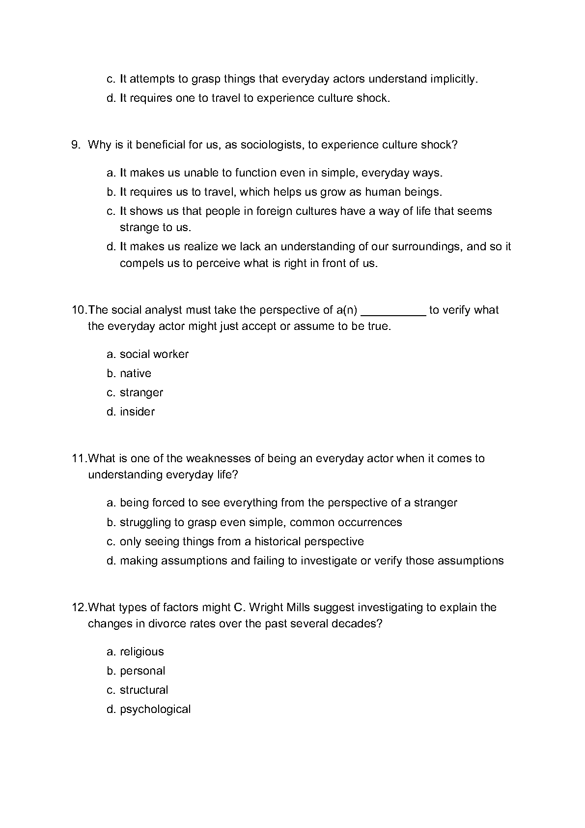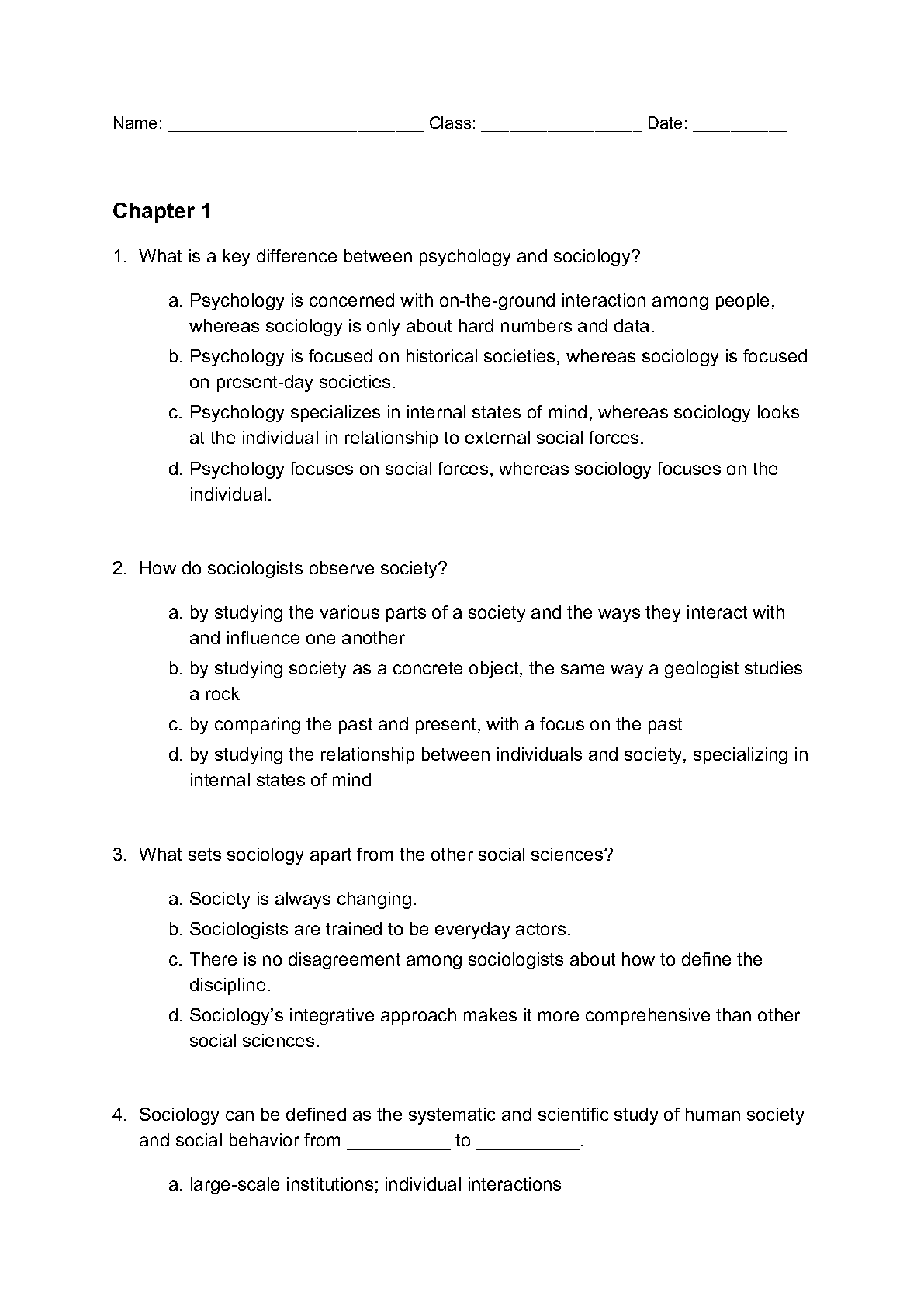 Access the complete Chapter 1 Test Bank for 'The Real World: An Introduction to Sociology,' 8th Edition by Kerry Ferris and Jill Stein. This essential study tool provides a wide range of multiple-choice questions designed to test your comprehension of the core concepts introduced in the first chapter. Perfect for exam preparation, this test bank helps you grasp the key differences between sociology and other social sciences, understand sociological perspectives, and build a strong foundation for the entire course. Download now to start practicing and ensure you're ready to ace your quizzes and exams.