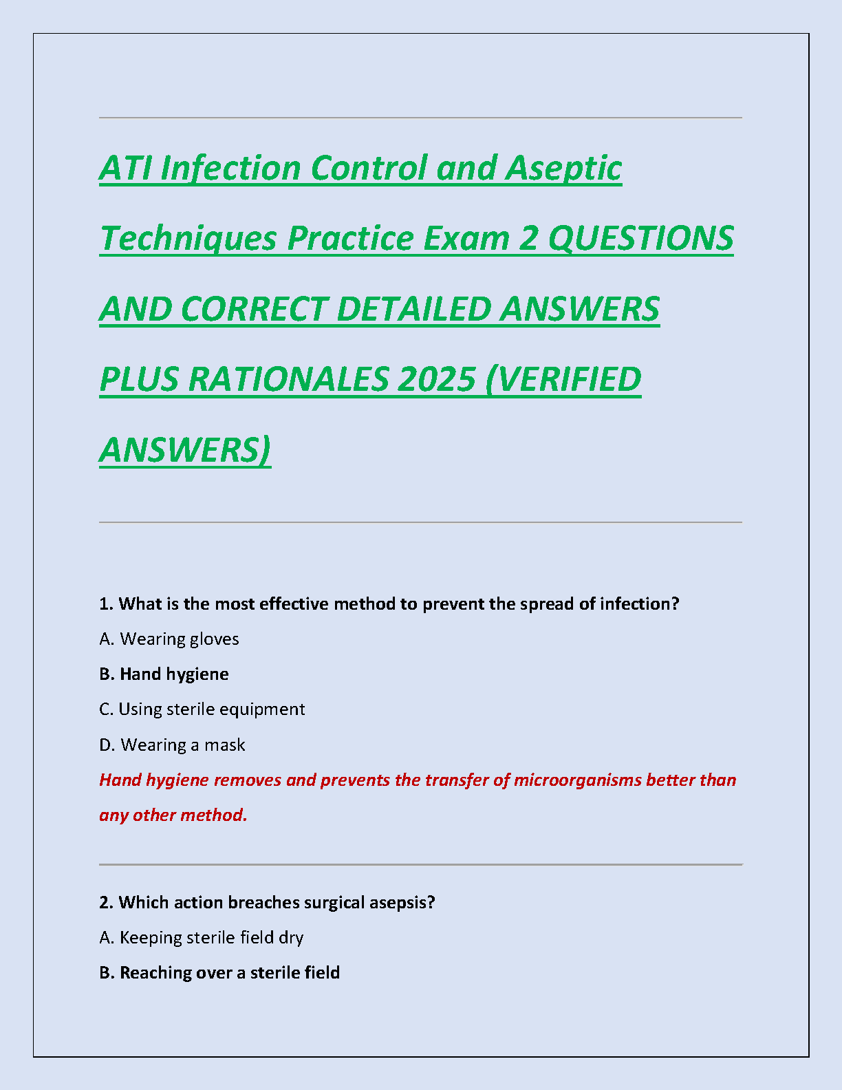 ATI Infection Control and Aseptic Techniques Practice Exam 2 Test Bank - 2025 Edition with Questions, Answers & Rationales