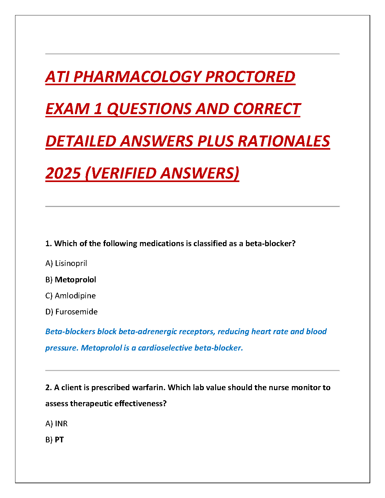 Unlock your full potential and conquer the ATI Pharmacology Proctored Exam with our newly released 2025/2026 test bank. This comprehensive study guide is meticulously designed to help nursing students pass on their very first try, eliminating the stress of resits. Inside, you'll find a wealth of exam-style questions, each accompanied by a verified correct answer and a detailed, easy-to-understand rationale. Our resource covers critical pharmacology topics, such as medication classifications (e.g., beta-blockers) and monitoring therapeutic effectiveness, ensuring you have the knowledge and confidence to excel. Stop cramming and start understanding—get the ultimate tool for guaranteed success on your ATI Pharmacology exam!