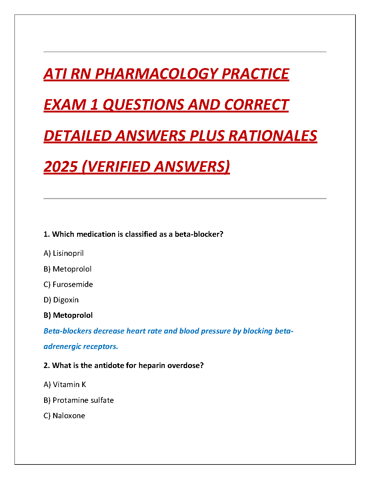 Prepare to ace your ATI RN Pharmacology exam with our 2025 updated test bank for Practice Exam 1. This essential study guide features a comprehensive collection of practice questions, each with a verified correct answer and a detailed, easy-to-understand rationale. By understanding the reasoning behind each answer, you'll deepen your grasp of critical pharmacology concepts and build the confidence needed to succeed. This resource is expertly designed to help you master the material, avoid resits, and pass your exam with flying colors on your first attempt.