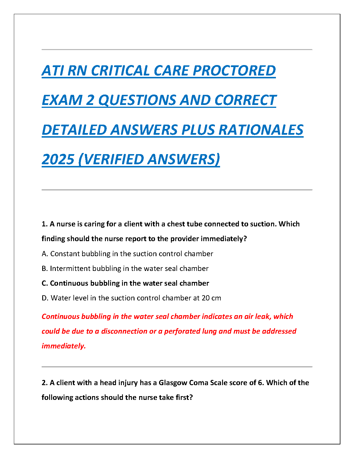 ATI RN Critical Care Proctored Exam 2 Test Bank 2025/2026: Comprehensive Questions, Verified Answers, and Detailed Rationales for Exam Success
