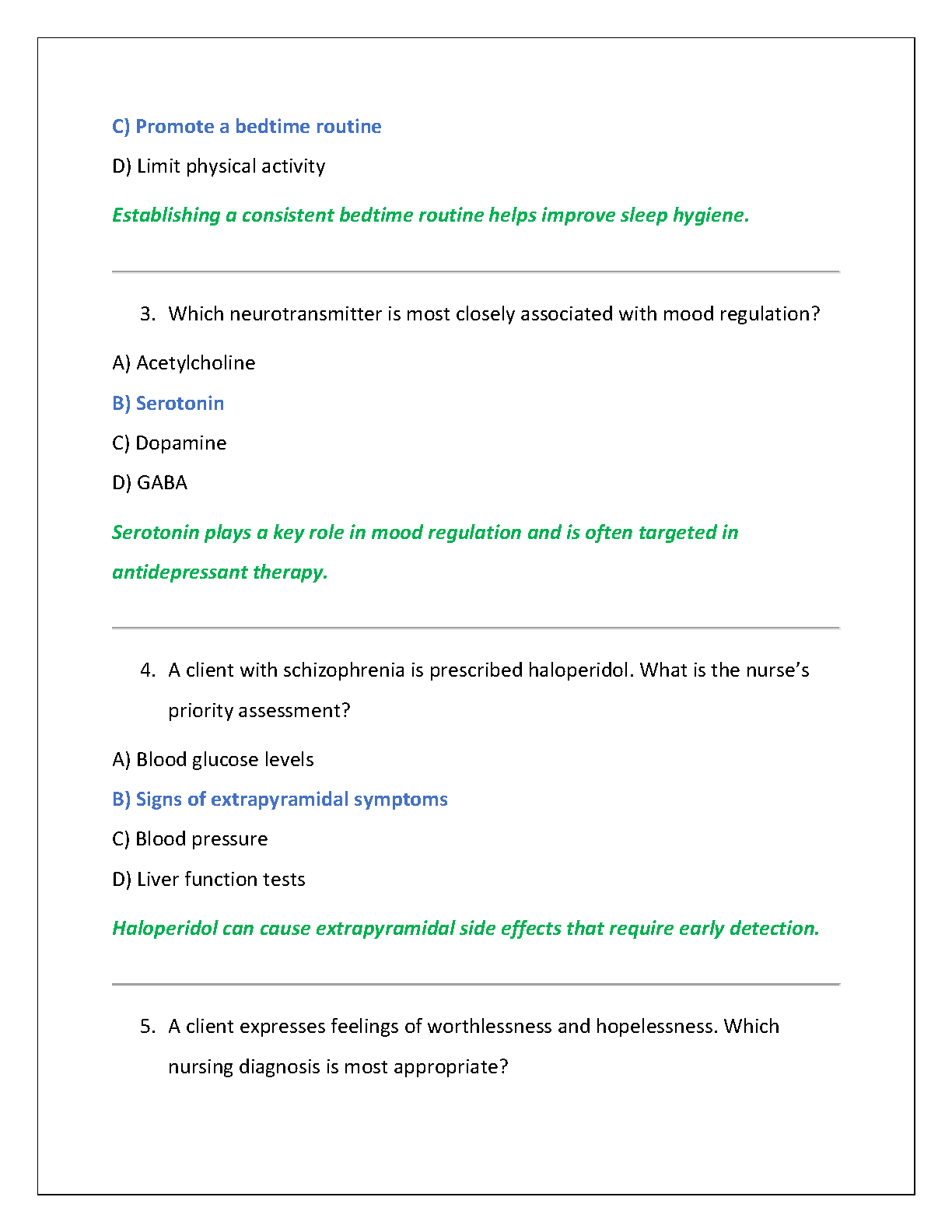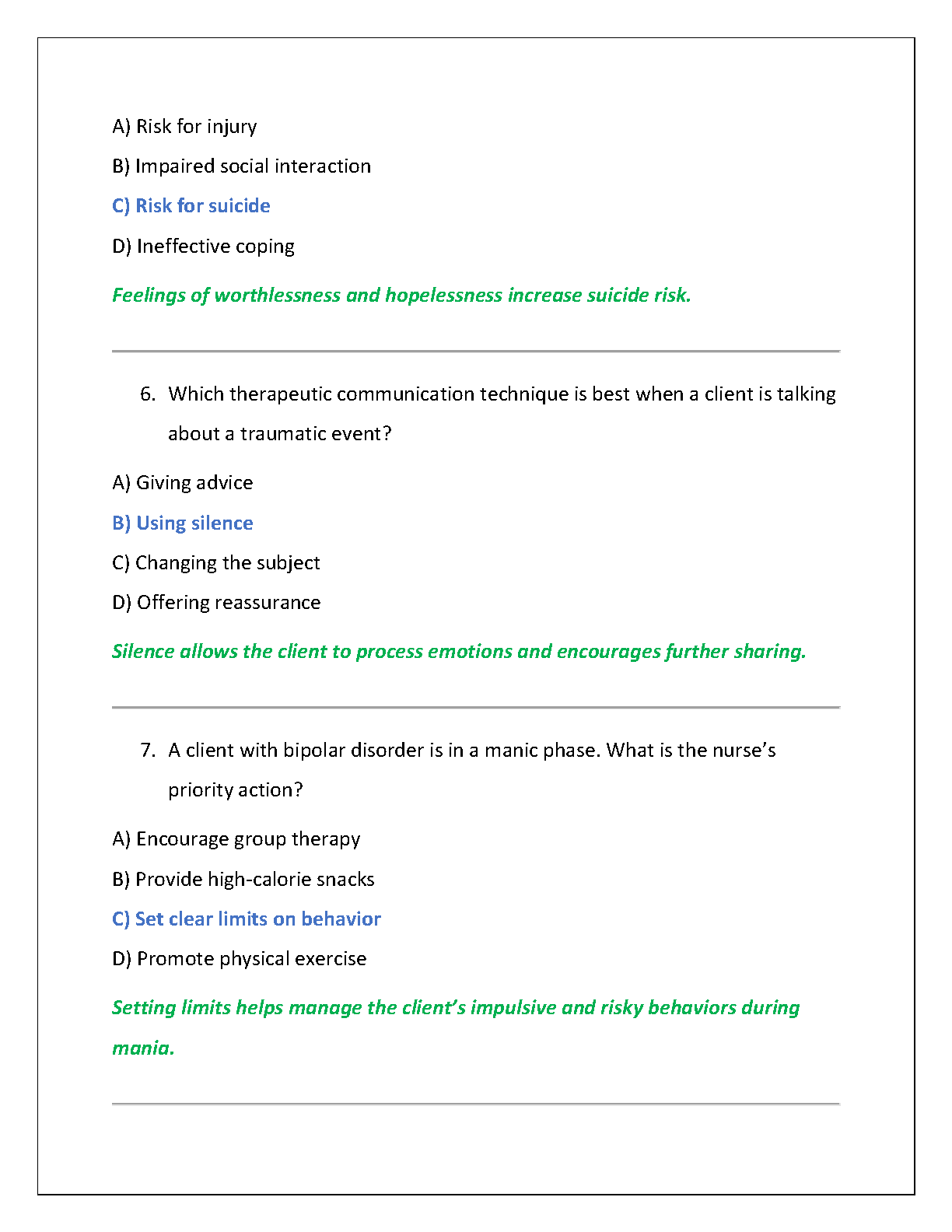 Unlock success on your upcoming nursing exams with our latest 2025 study guide for the ATI RN Mental Health Proctored Exam 2. This comprehensive resource is packed with a wide range of practice questions, each accompanied by verified, correct answers and in-depth rationales. Designed to deepen your understanding of key mental health nursing concepts, this guide helps you grasp not just *what* the right answer is, but *why*. Prepare effectively, build your confidence, and master the material needed to excel on your proctored exam.