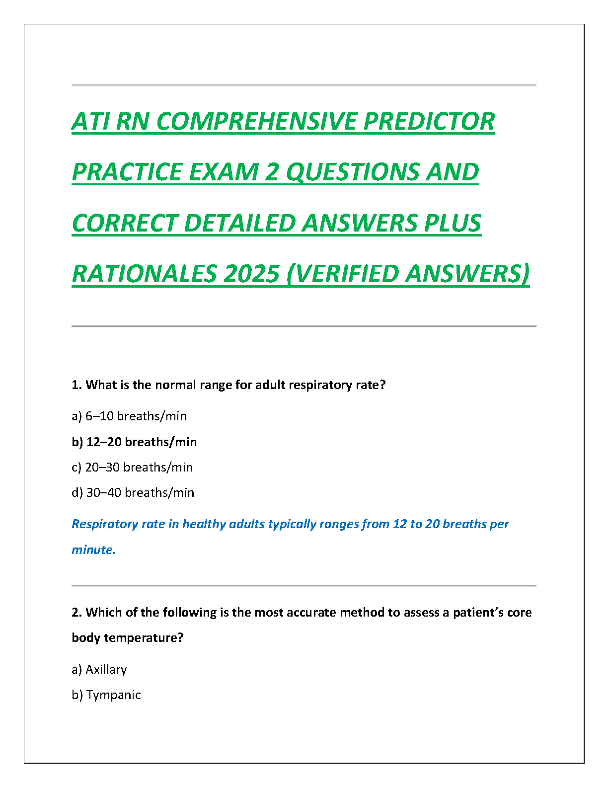 Ace your nursing finals with the ultimate study resource for the ATI RN Comprehensive Predictor Exam. This 2025 test bank for Practice Exam 2 provides a complete set of questions, 100% correct answers, and in-depth rationales for each. Designed to mirror the actual exam, this guide helps you master critical concepts, identify areas for improvement, and build the confidence needed to pass on your first attempt. Stop worrying about resits and secure your success with these verified and expertly-explained materials.