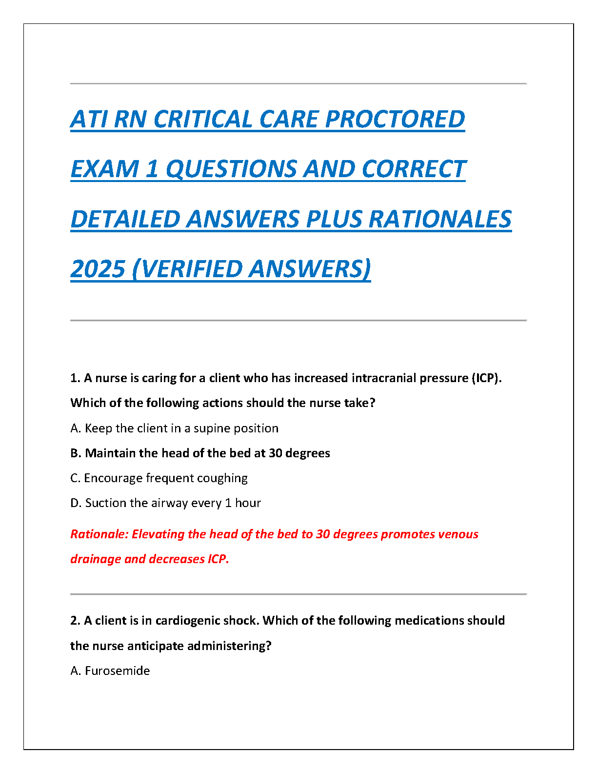 ATI RN Critical Care Proctored Exam 1 Test Bank 2025/2026 | Verified Questions & Rationales for First-Attempt Success