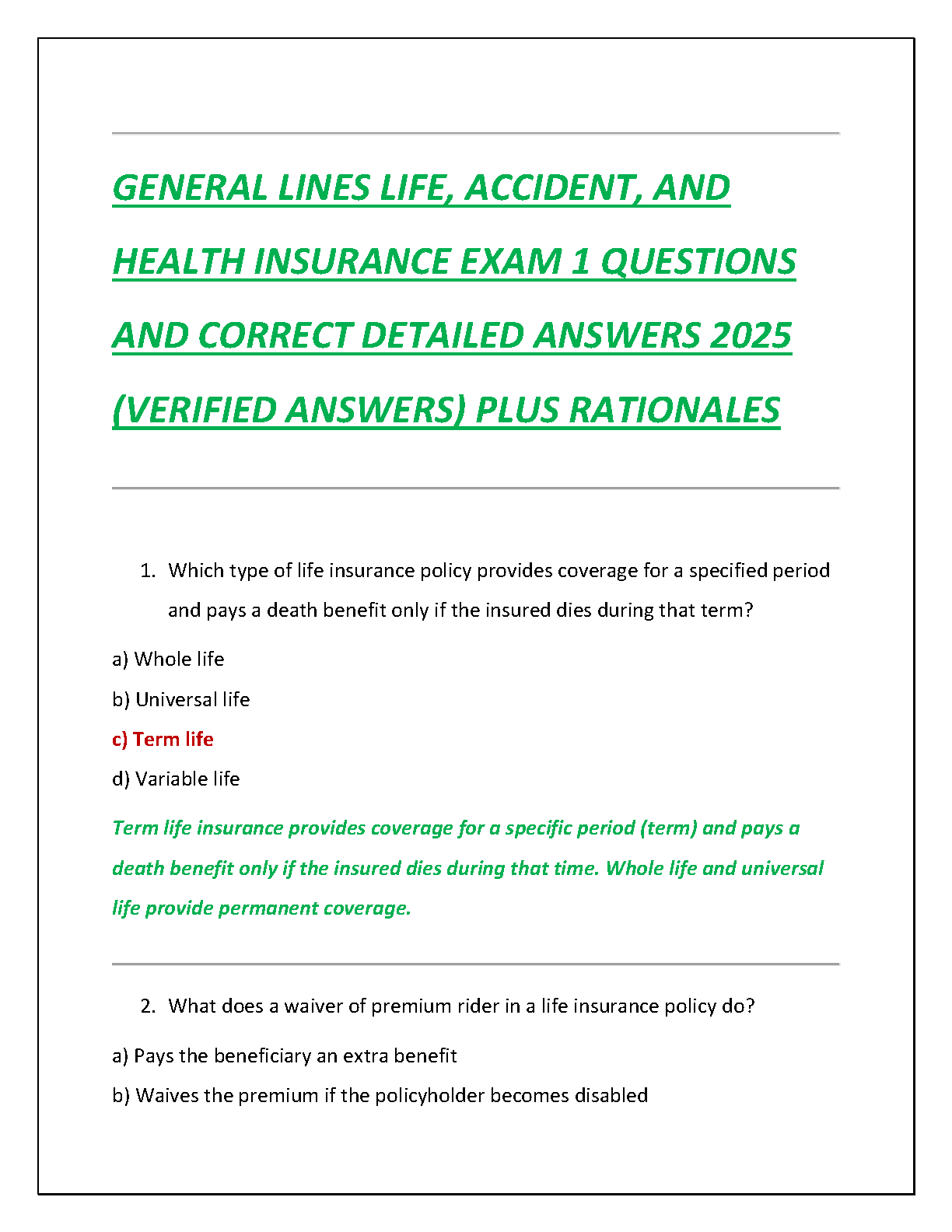 Prepare to ace your General Lines Life, Accident, and Health Insurance license exam with our comprehensive 2025 test bank. This essential study guide is packed with practice questions that mirror the actual exam format. Each question comes with a correct, verified answer and a detailed rationale to ensure you not only memorize the material but truly understand the core concepts. Move beyond simple memorization and gain a deep understanding of topics like term life, policy riders, and health insurance principles. Our expertly crafted rationales explain the 'why' behind each answer, solidifying your knowledge and boosting your confidence. This resource is designed to help you identify weak areas, master difficult topics, and pass your certification exam on the very first try. Stop worrying about resits and start your insurance career with confidence!