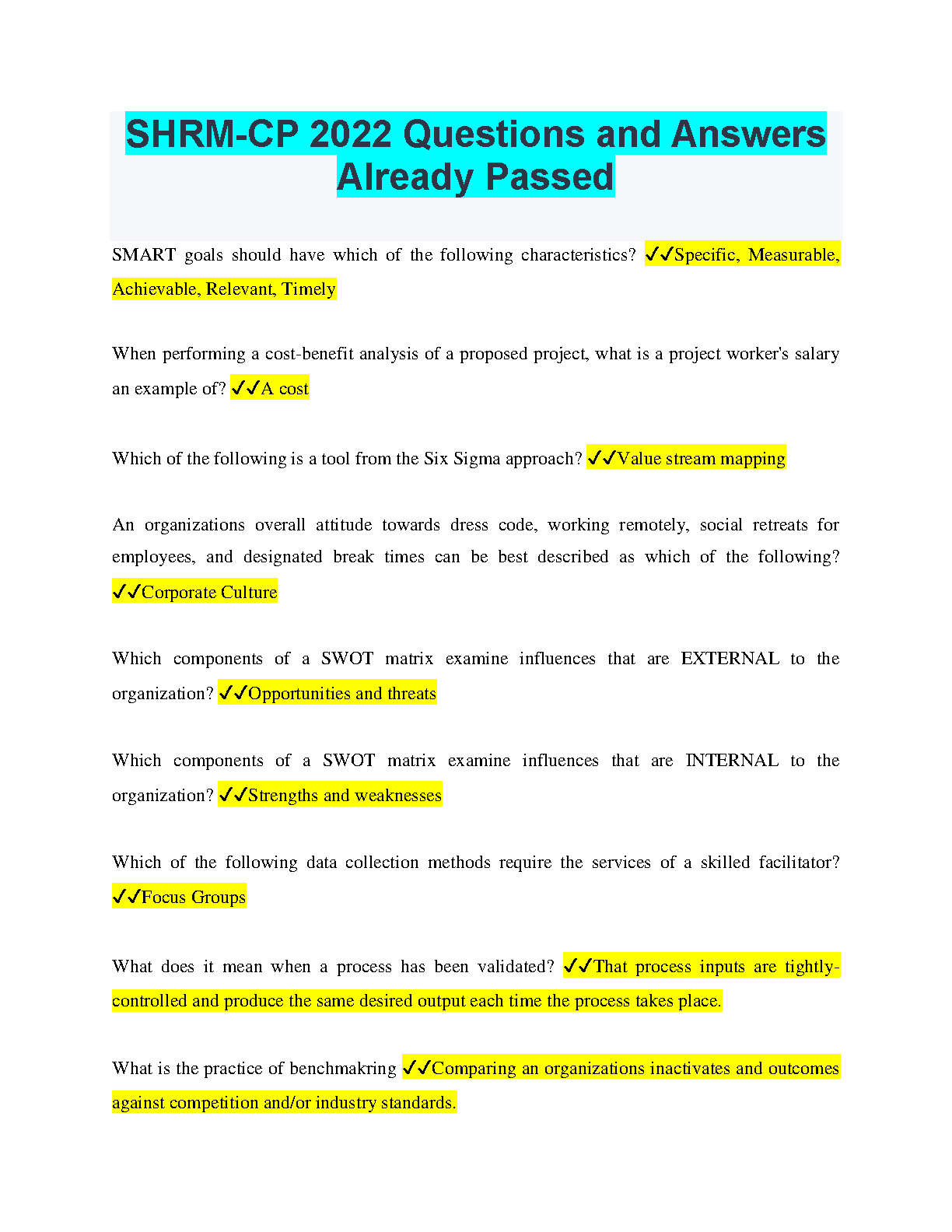 Ace your SHRM-CP certification with our comprehensive 2024/2025 test bank! This essential study guide features a complete collection of verified practice questions and detailed, accurate answers, covering all key HR competencies tested on the exam. Master crucial topics such as strategic planning (SMART goals, SWOT analysis), Six Sigma, corporate culture, and benchmarking. Designed to simulate the real exam experience, this resource is your ultimate tool to build confidence, identify knowledge gaps, and ensure you pass the SHRM-CP exam on your very first attempt. Get ready to advance your HR career!
