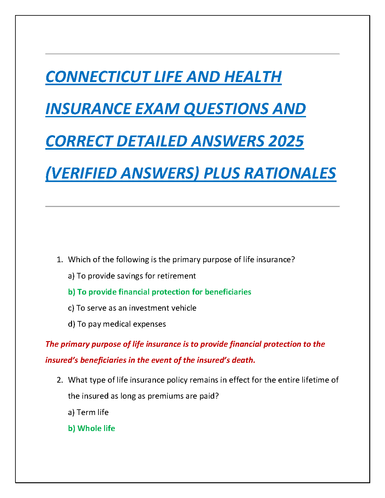 Connecticut Life and Health Insurance Exam 2025 Test Bank: Verified Q&A with Rationales to Ace Your Test
