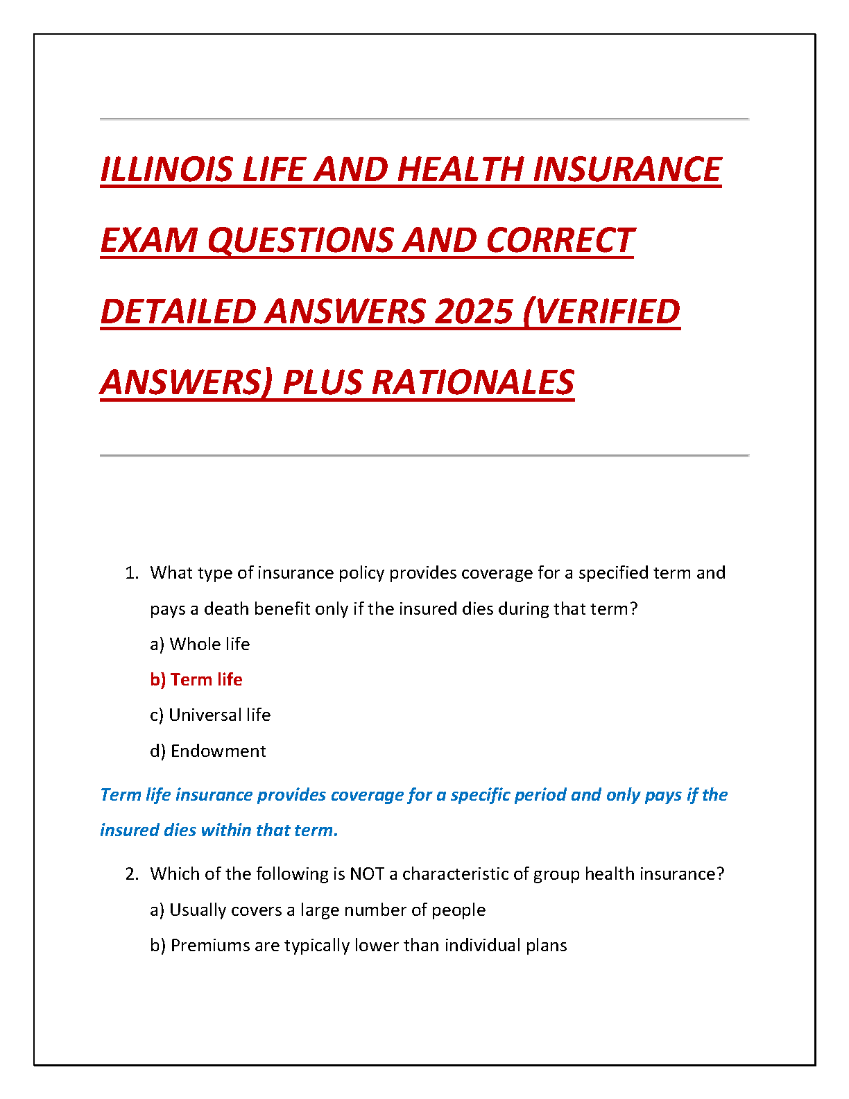 Illinois Life and Health Insurance Exam 2025 Test Bank: Verified Questions, Detailed Answers, and Rationales