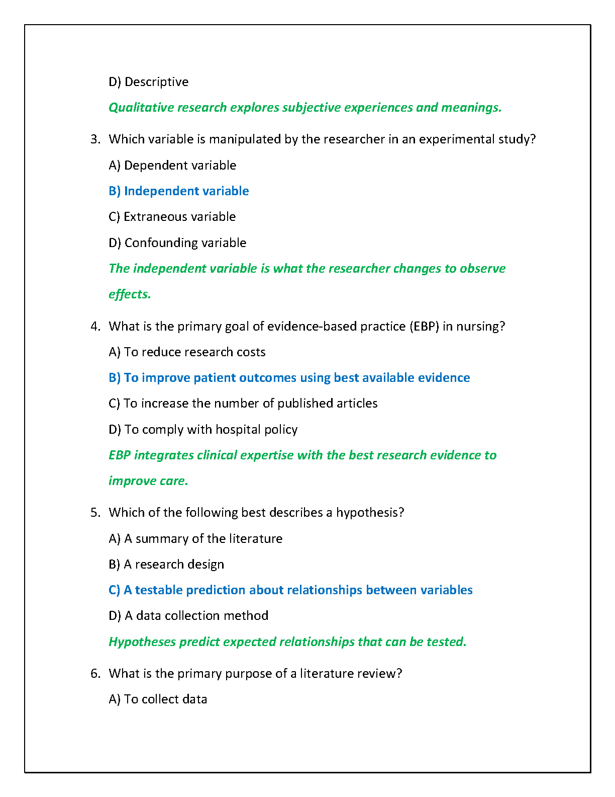 Master the essential concepts of nursing research and ace your final exam with this comprehensive test bank for Walden University's NURS 3150: Foundations of Nursing Research. This up-to-date 2025 resource provides a complete set of final exam questions, each paired with a verified correct answer and a detailed rationale. Go beyond simple memorization and truly understand the principles of the research process. This study guide is expertly designed to help you prepare effectively, boost your confidence, and pass your exam on the first attempt. Download now to get the ultimate tool for success in NURS 3150.