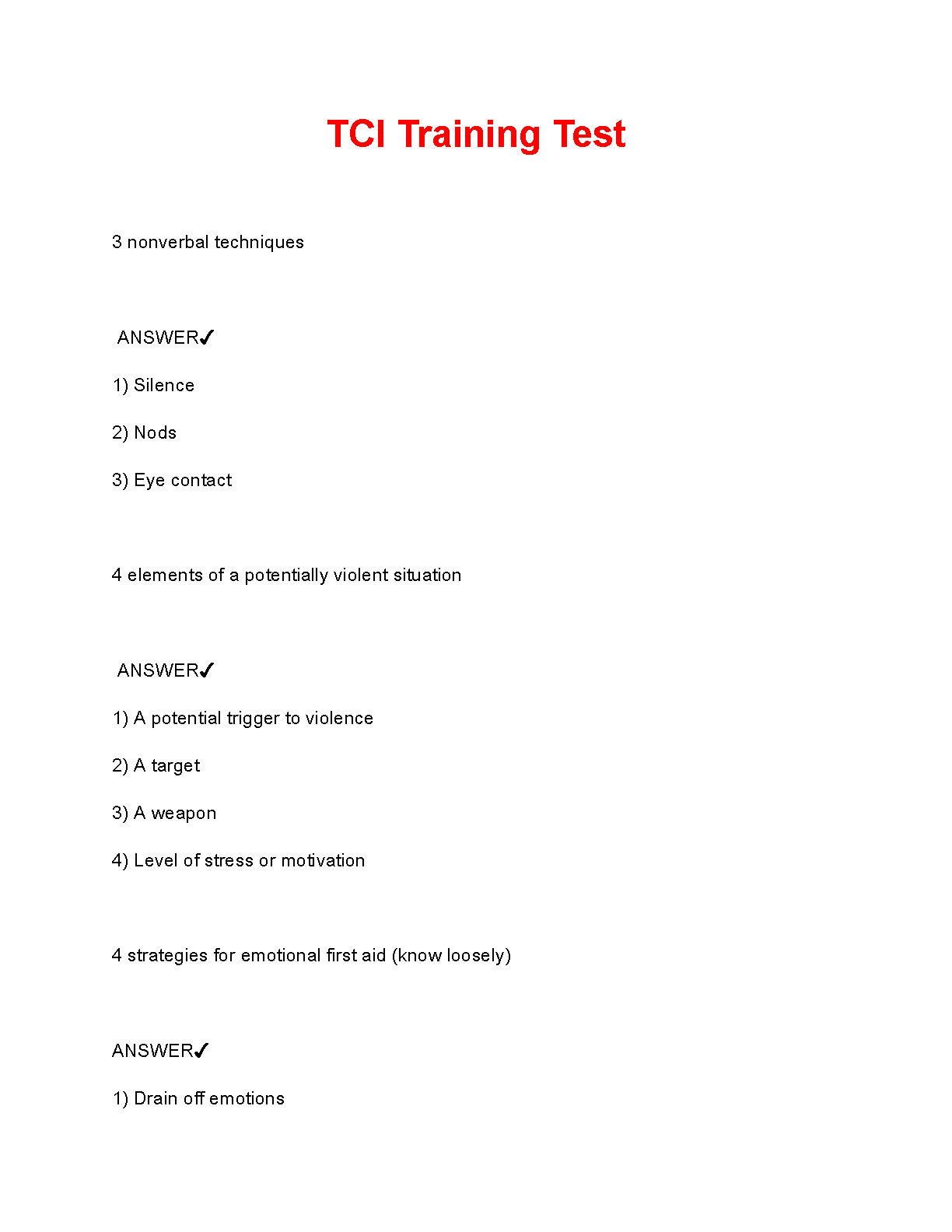 Ace your Therapeutic Crisis Intervention (TCI) certification with our complete test bank! Based on the renowned TCI system from Cornell University's Residential Child Care Project, this resource features a comprehensive collection of exam questions with verified answers. Master key topics like nonverbal de-escalation techniques, assessing potentially violent situations, and emotional first aid. This is the ultimate study guide to help you pass the TCI training test confidently on your first try. Get instant access and prepare to succeed!