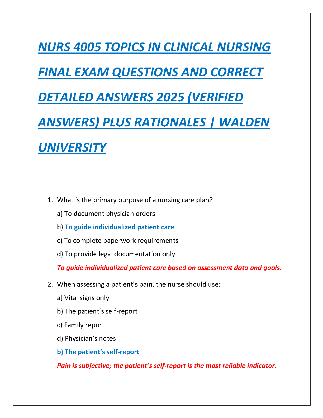 NURS 4005 Topics in Clinical Nursing Final Exam Test Bank 2025 - Walden University | Verified Questions, Answers & Rationales